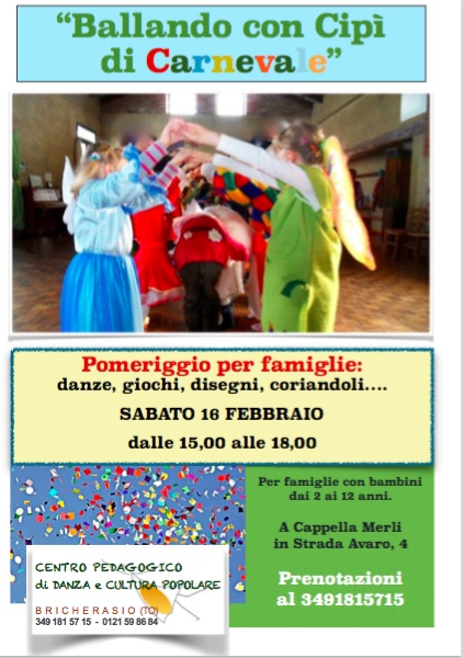 Sabato 16 febbraio dalle 15,00 alle 18,00 "BALLANDO CON CIPI’ DI CARNEVALE”. Pomeriggio di danze, giochi, disegni e coriandoli… per famiglie con bambini dai 3 agli 11 anni tutti rigorosamente in maschera. Appuntamento a Cascina Marie a Cappella Merl,i in strada Avaro, 4. Prenotazione obligatoria al 3491815715