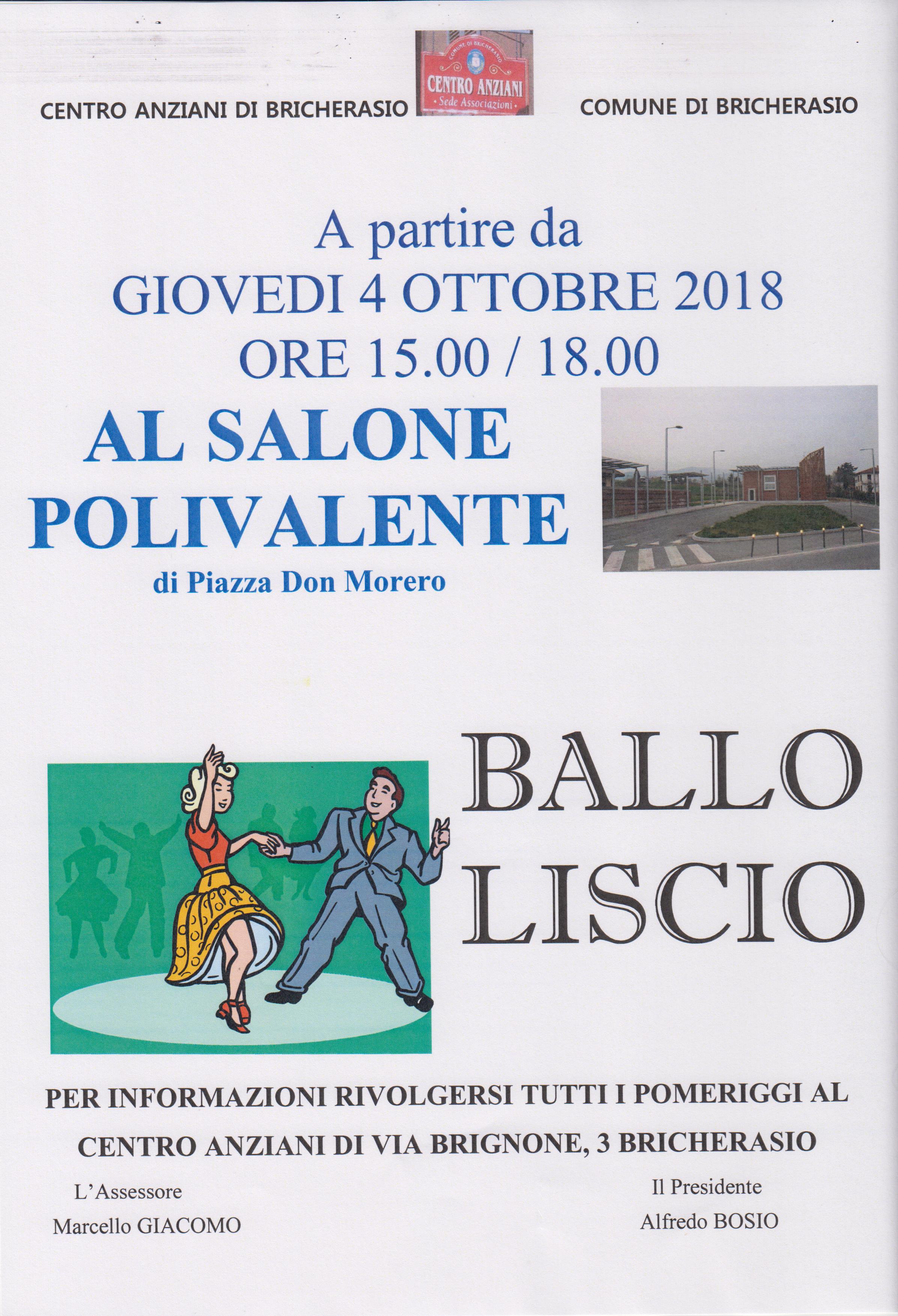 Il Centro Anziani di Bricherasio in collaborazione con il Comune offre la possibilità di ballare il liscio al salone polivalente di Piazza Don Morero tutti i giovedì a partire dalle 15,00 con inizio giovedì 4 ottobre. Per informazioni rivolgersi, tutti i pomeriggi, dalle ore 15.00 alle 18.00, presso il Centro Anziani di Via Brignone, 3 a Bricherasio.