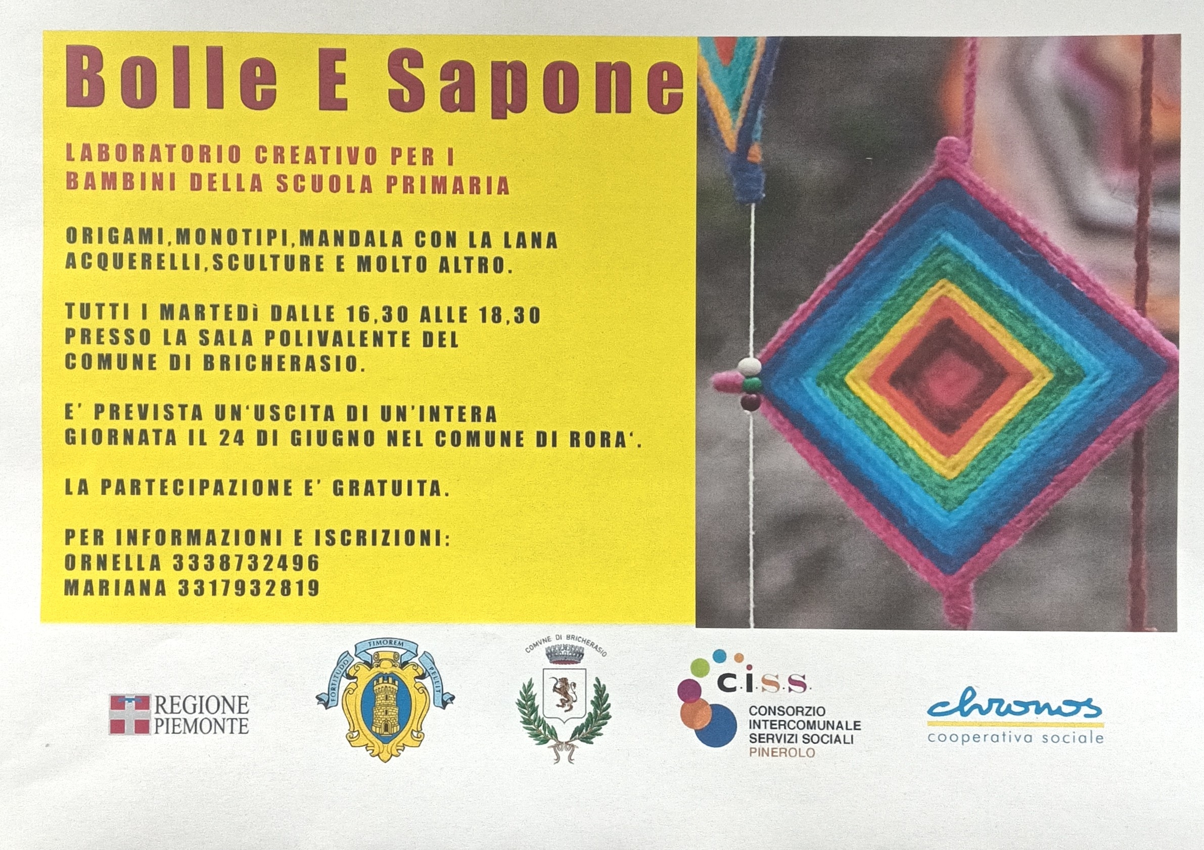 Tutti i martedì dei mesi di maggio e giugno dalle 16.30 alle 18.30 presso il salone polivalente di Piazza Don Morero , 4 a Bricherasio il laboratorio creativo "Bolle E Sapone" accoglie i bambini della scuola primaria per attività artistiche e manuali. La partecipazione è gratuita, consigliata preadesione telefonica da Ornella al numero 333/8732496 oppure Mariana al 331/7932819. Il laboratorio si inserisce nell'ambito del progetto "Educare, crescere, proteggere: percorsi d'intervento e prevenzione territoriale", finanziato da Regione Piemonte e promosso dai Comuni di Torre Pellice, Bricherasio e Rora', dal CISS di Pinerolo, dagli istituti scolastici e dalle cooperative sociali attive sul territorio.