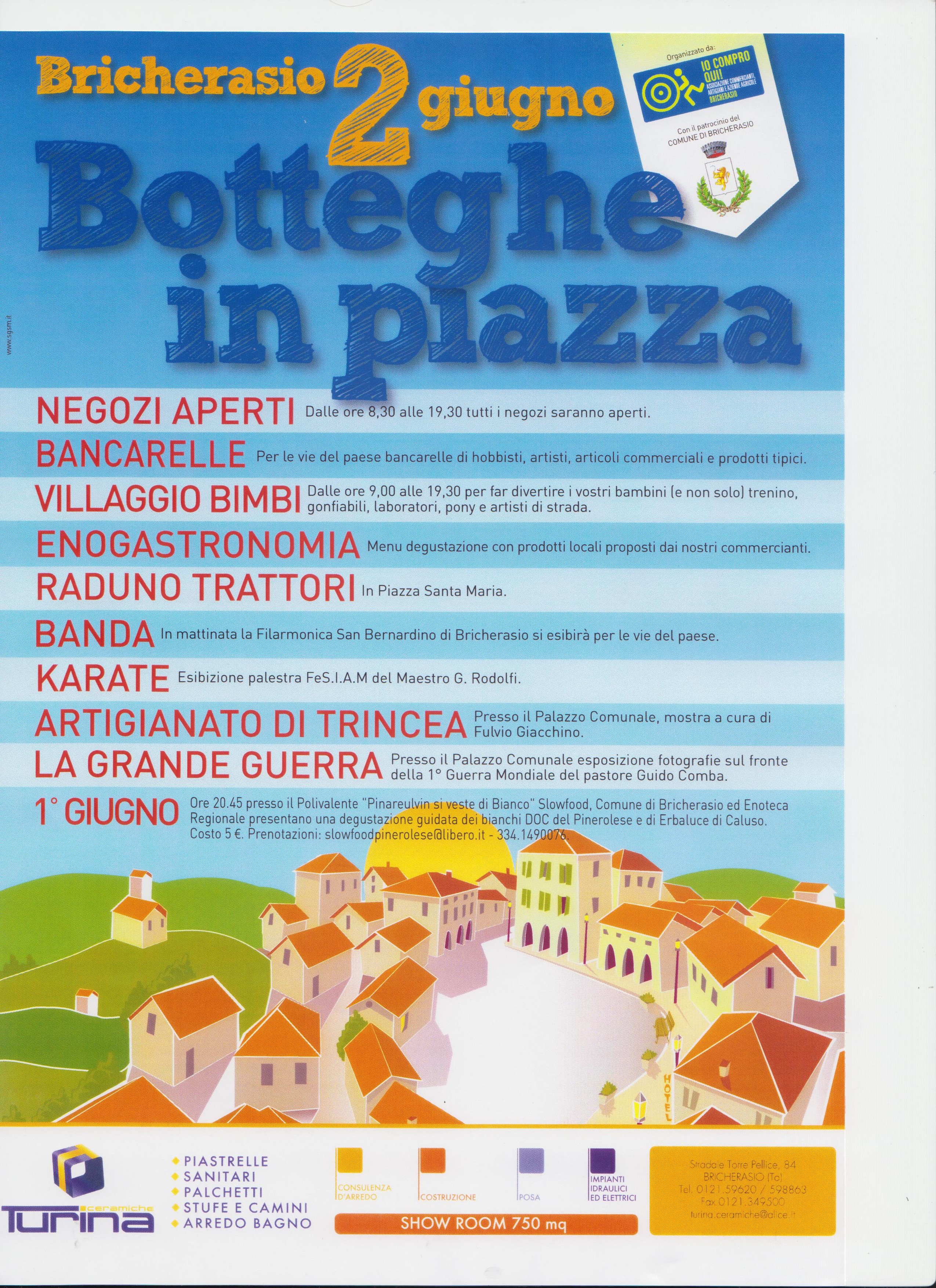 L'Associazione Commercianti artigiani e aziende agricole di Bricherasio con il patrocinio del Comune organizza per giovedì 2 giugno l’ottava edizione della rassegna “Botteghe in piazza”. Un appuntamento diventato classico per i bricherasiesi legato al gusto e alla conoscenza degli antichi mestieri, dell’arte, dell’artigianato e degli antichi sapori della tradizione enogastronomica locale. L’evento è un’occasione per riscoprire il mondo dell’artigianato, valore della tradizione che pur avendo subito negli ultimi anni un’importante flessione sta ora riacquistando importanza come emblema della potenzialità produttiva italiana: la creatività, l’attenzione alla qualità, la cura attribuita al singolo prodotto che diviene quindi un pezzo unico. L’appuntamento prevede l’apertura dei negozi del paese dalle ore 8.30 alle 19.30, l'esibizione in mattinata della Filarmonica San Bernardino per le vie del paese e la dimostrazione di arti marziali a cura della FeS.I.A.M. del Maestro Gianlivio Rodolfi, il raduno di trattori, il villaggio dei bimbi per far divertire i piccoli con trenino, gonfiabili, laboratori, pony ed artisti di strada, il mercato con bancarelle per le vie del paese di hobbisti, artisti, articoli commerciali e prodotti tipici. Presso il palazzo comunale inoltre ci sarà una mostra a cura di Fulvio Giacchino sull’Artigianato di trincea e un'esposizione di fotografie sul fronte della Prima Guerra Mondiale del Pastore Guido Comba, che resterà aperta fino a domenica 5 giugno.