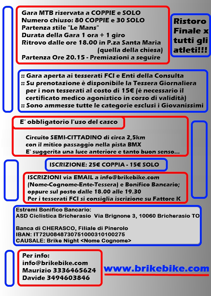 La Società Ciclistica Bricherasio Brike Bike con il patrocinio dell’Assessorato allo Sport del Comune di Bricherasio organizza per giovedì 12 giugno la terza edizione della “Brike night”, corsa serale in mountain bike, a coppie o, per i primi 30 iscritti, in solitaria su di un circuito semi-cittadino di 2,5 km, con il mitico passaggio nella pista bmx di Via Bellville. Ritrovo dalle ore 18 in Piazza Santa Maria e dopo il briefing delle 20 la partenza fissata alle 20,15 a cui seguirà la premiazione e ristoro finale per gli atleti. Alla gara sono ammessi tutti i tesserati F.C.I. ed Enti della Consulta e tutte le categorie esclusi i giovanissimi. Si ricorda che possono partecipare alla notturna anche gli atleti non tesserati che, presentandosi con certificato medico agonistico, potranno sottoscrivere la tessera giornaliera al costo di 15 euro. L’iscrizione costa 25 € a coppia e 15 € per la formula “Solo”. Le adesioni si ricevono tramite bonifico bancario sull’IBAN: IT72U0848730751000310100275 della Banca di Cherasco, Agenzia di Pinerolo con causale del versamento: Brike Night 2014 e indicando cognome e nome. Ci si può iscrivere il giorno della gara dalle 18 alle 19,30, per i tesserati si consiglia l’iscrizione su fattore K e si suggerisce l’uso di una luce anteriore, con tanto buon senso, ed è obbligatorio l’uso del casco. Maggiori informazioni si trovano sul sito dell’associazione bricherasiese: info@brikebike.com o telefonando a Maurizio al numero 333/6465624 oppure a Davide al 349/4603846.