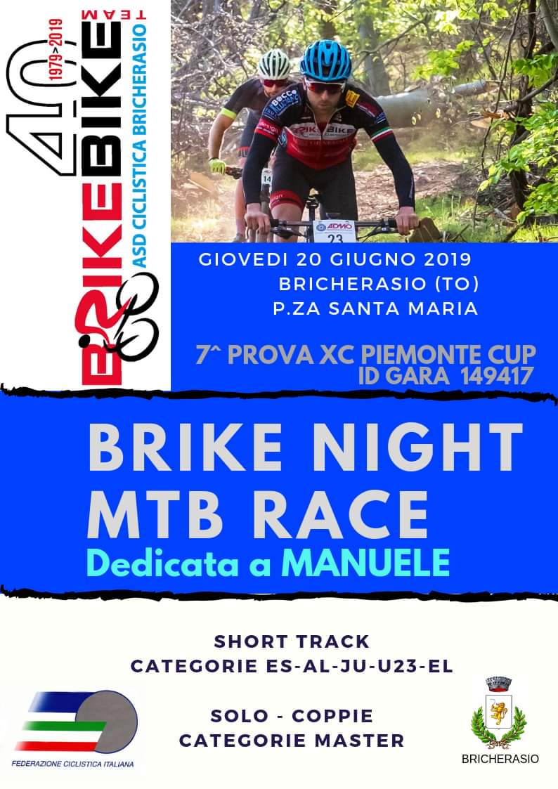 Sono aperte le iscrizioni all’8ª edizione della “Brike night”, corsa serale in mountain bike, organizzata per giovedì 20 giugno a partire dalle ore 19, dalla Società Ciclistica Brike Bike di Bricherasio con il patrocinio dell’Assessorato allo Sport del Comune di Bricherasio valevole come settima prova del circuito Piemonte Cup e dedicata a Manuele Bellasio, il giovane ciclista affiliato alla società bricherasiese, vittima nella caduta del Ponte Morandi a Genova. Si può aderire alla corsa recandosi nella sede dell’Associazione ciclistica in Via Brignone, 3 il lunedì sera dalle ore 21 alle 22,30 oppure “Al Briche Risto Bar” di Via Vittorio Emanuele II, 70. La gara, con partenza in griglia, è riservata alle categorie agonistiche Esordienti, Allievi, Juniores, Under 23 ed Elite nella categoria Short Track ed è aperta alle coppie ed ai solitari. Il programma prevede il ritrovo in Piazza Santa Maria per le iscrizioni alla corsa Short Track dalle ore 17 alle 18,30 mentre le adesioni alla sfida a coppie e solitari dalle 18,30 alle 19,30 con partenze dalle 19 a cui seguirà la premiazione e ristoro finale per gli atleti. Alla gara sono pure ammessi tutti i tesserati F.C.I. ed Enti della Consulta. Si ricorda che possono partecipare alla notturna anche gli atleti non tesserati che, si presentano con certificato medico agonistico. Il costo di partecipazione è di € 5 per gli agonisti dello Short Track, di € 20 per le coppie e di € 15 per chi gareggia da solo. “Come sempre il team Brike Bike si pone l’obbiettivo di far conoscere il mondo della bicicletta in tutti i suoi aspetti, dalla formazione al cicloturismo, dallo svago all’agonismo”, esordisce così il tesoriere dell’Associazione bricherasiese Maurizio Cavallero che prosegue “Brike Night è una formula ormai consolidata di evento mountain bike, da svolgersi a coppie in staffetta, oppure da soli ed è una manifestazione che porta la MTB nel centro del paese e permette di far vivere a tutti questo magnifico sport e consiglio l’utilizzo delle luci”. Partenza, arrivo e tutta la logistica hanno luogo in Piazza Santa Maria. Si sviluppa su un percorso semi-cittadino di circa 3 km misto asfalto, ciottolato e sterrato, con brevi salite e discese molto divertenti e con il passaggio nella pista bmx di Via Bellville. Per maggiori informazioni rivolgersi al presidente Davide Turina al numero 349/4603846.