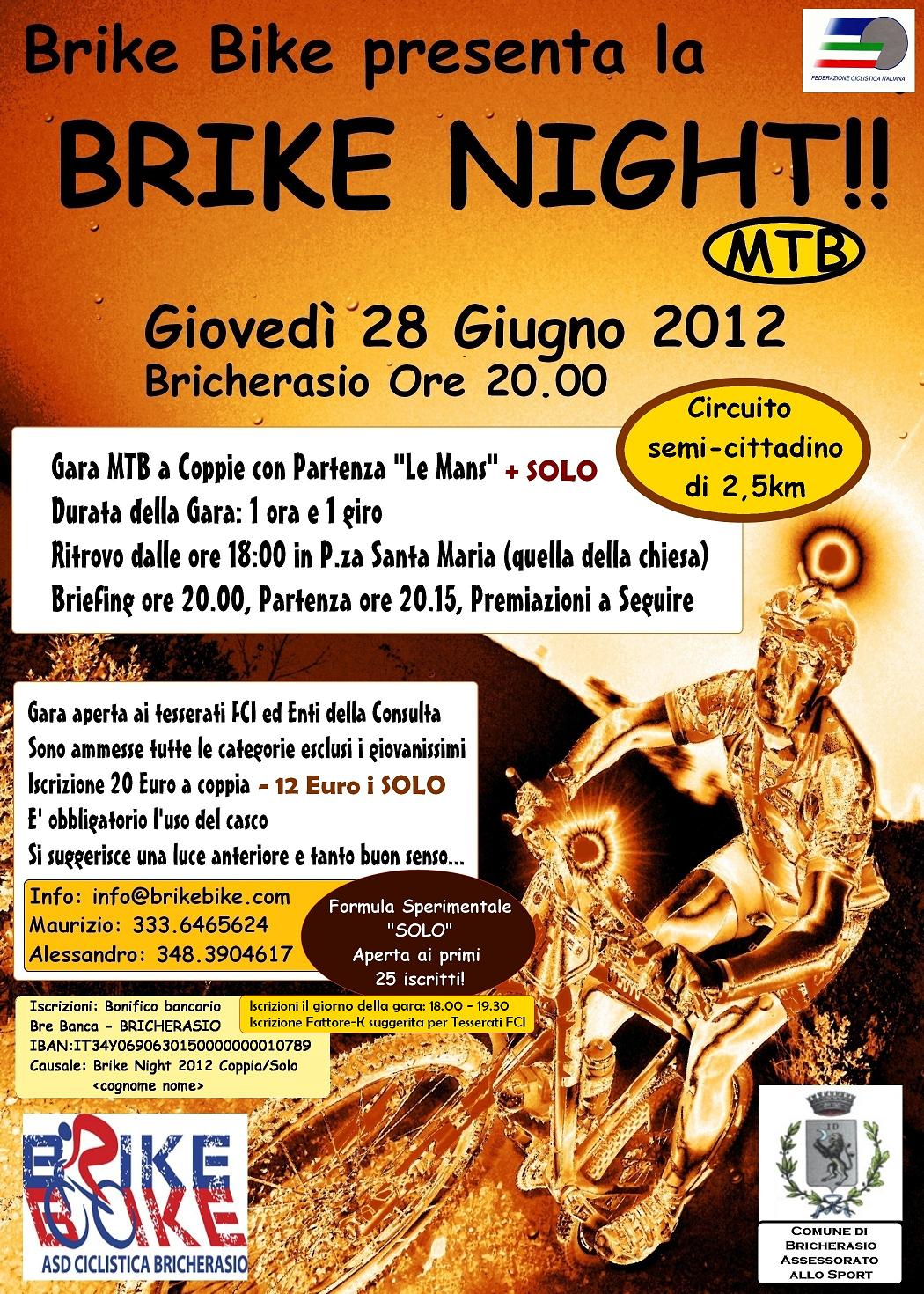 La Società Ciclistica Bricherasio Brike Bike con il patrocinio dell’Assessorato allo Sport del Comune di Bricherasio organizza per giovedì 28 giugno la “Brike night” corsa serale in mountain bike, a coppie o, per i primi 25 iscritti, in solitaria su di un circuito semi-cittadino di 2,5 km. Ritrovo dalle ore 18 in Piazza Santa Maria e dopo il briefing delle 20 la partenza fissata alle 20,15 a cui seguirà la premiazione. Alla gara sono ammessi tutti i tesserati F.C.I. ed enti della consulta e tutte le categorie esclusi i giovanissimi. Si ricorda che possono partecipare alla notturna anche gli atleti non tesserati che, presentandosi con certificato medico agonistico, potranno sottoscrivere la tessera giornaliera al costo di 5 euro. L’iscrizione costa 20 € a coppia e 12 € per la formula sperimentale “Solo”. Le adesioni si ricevono tramite bonifico bancario sull’IBAN: IT34Y0690630150000000010789 con causale del versamento: Brike Night 2012 Coppia/Solo e indicando cognome e nome. Ci si può iscrivere il giorno della gara dalle 18 alle 19,30 e si suggerisce l’uso di una luce anteriore, con tanto buon senso, ed è obbligatorio l’uso del casco. Maggiori informazioni si trovano sul sito dell’associazione bricherasiese: info@brikebike.com o telefonando a Maurizio al numero 333/6465624 oppure ad Alessandro al 348/3904617.