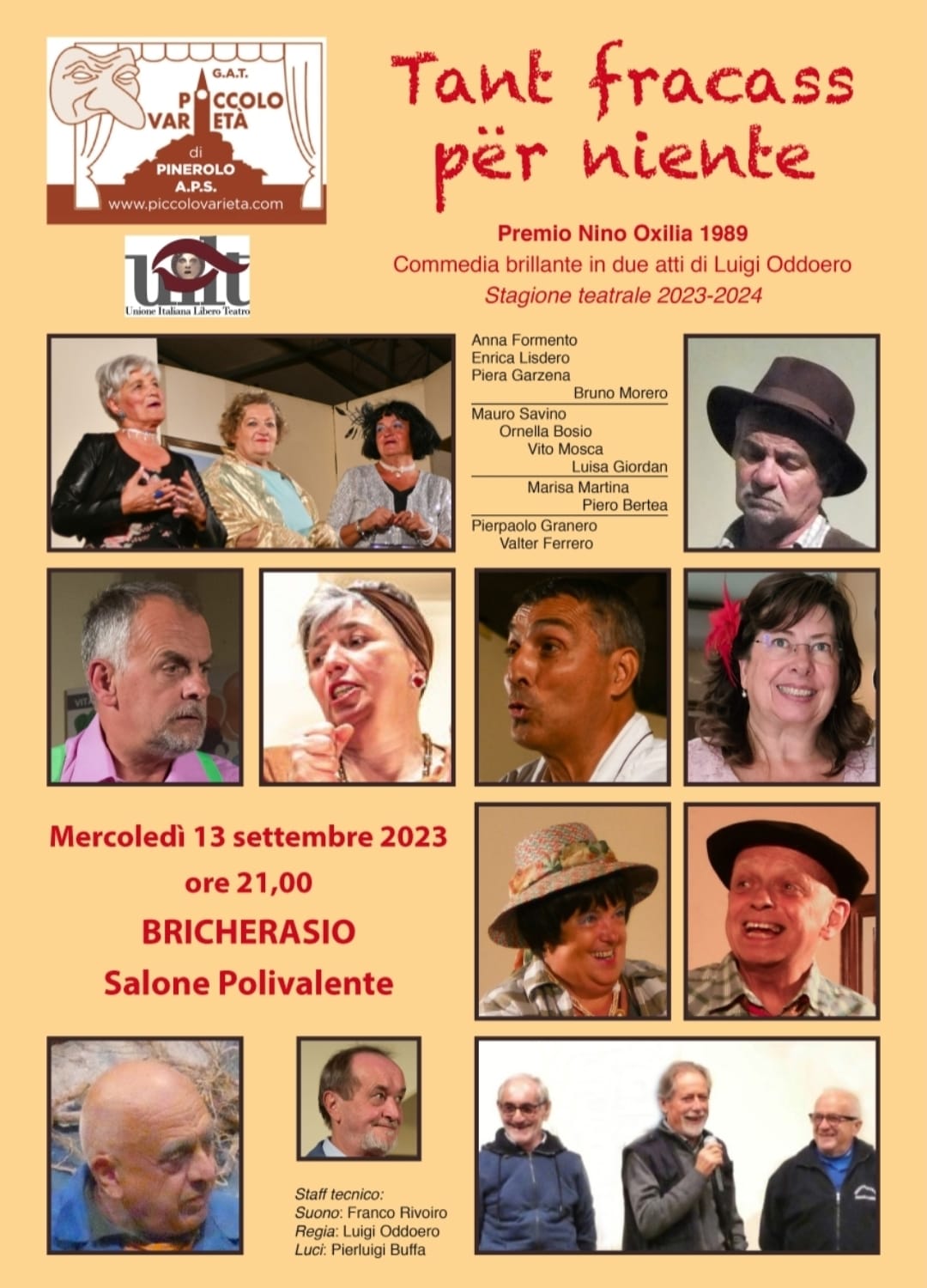 Altro irrinunciabile appuntamento è la commedia dialettale di mercoledì 13 alle ore 21 al Salone Polivalente. Torna, come ogni anno, il Piccolo Varietà di Pinerolo con gli attori pluripremiati di Luigi Oddoero che rappresentano Tant fracass per niente, commedia dialettale brillante in due atti con alcuni bricherasiesi protagonisti. Il lavoro dell’equipe teatrale ha vinto il Premio Nino Oxilia e vede la partecipazione di Valter Ferrero e Anna Chiattone. La parola d'ordine del Piccolo Varietà è divertirci divertendo e racchiude tutta la vocazione rappresentata nelle commedie in lingua piemontese in oltre quaranta anni sul palcoscenico