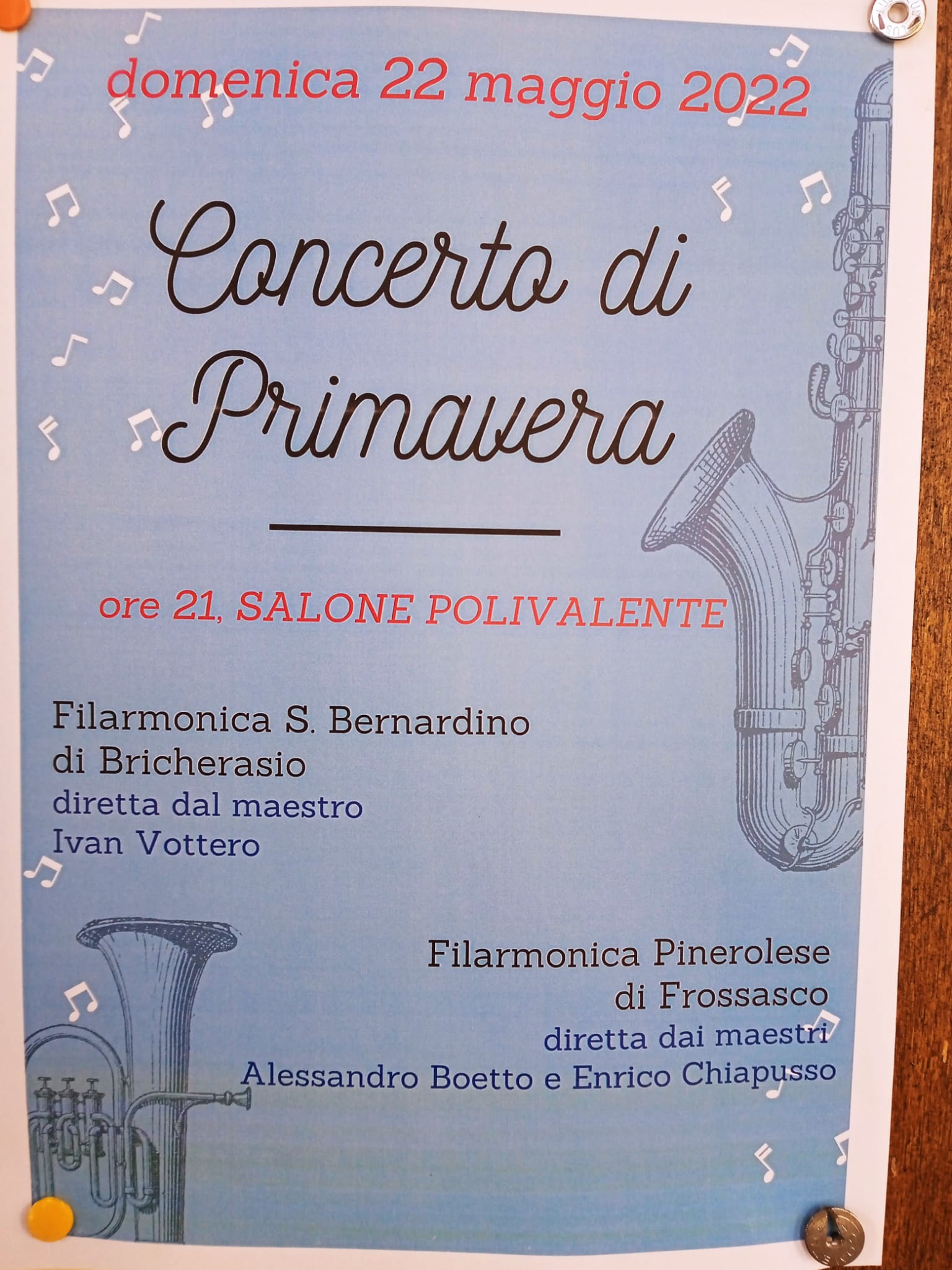La Filarmonica San Bernardino di Bricherasio, diretta dal Maestro Ivan Vottero, presenta, con il patrocinio del Comune, Domenica 22 maggio alle ore 21 nel Salone Polivalente di Piazza Don Vittorio Morero, 2 a Bricherasio, il tradizionale concerto di primavera. Ospite della serata di musica la Filarmonica Pinerolese di Frossasco diretta dai maestri Alessandro Boetto ed Enrico Chiapusso. Ingresso libero.