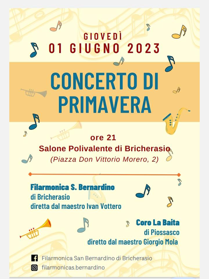 La Filarmonica San Bernardino di Bricherasio, diretta dal Maestro Ivan Vottero, presenta, con il patrocinio del Comune, giovedì 1 giugno alle ore 21 nel Salone Polivalente di Piazza Don Vittorio Morero, 2 a Bricherasio, il tradizionale concerto di primavera con ospite il Coro La Baita di Piossasco diretto dal Maestro Giorgio Mola. Ingresso libero. Ulteriori informazioni sulla pagina facebook della banda bricherasiese e su instagram filarmonicas.bernardino