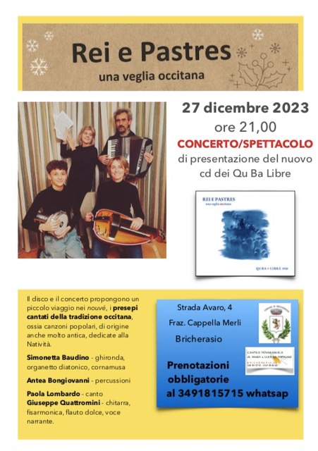 Mercoledì 27 dicembre alle ore 21.00 a Cascina Marie in Strada Avaro, 4 nella frazione Cappella Merli di Bricherasio, QuBa Libre Trio presenta il nuovo CD "Rei e Pastres una veglia occitana" dedicato ai nouvé, i canti natalizi della tradizione d'Oc. Prenotazioni obbligatorie al numero 349/1815715.