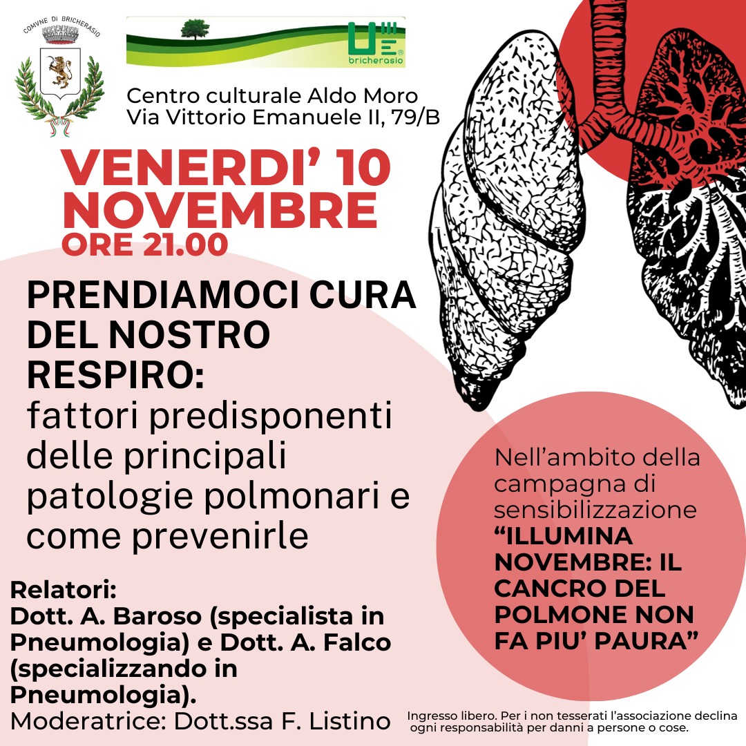 Venerdì 10 novembre alle ore 21 al Centro Culturale "Aldo Moro" di Via Vittorio Emanuele II, 79/B a Bricherasio il Comune organizza, in collaborazione con l'Unitre che apre il ciclo di conferenze e proiezioni, una serata sulla Pneumologia che riguarda la cura del nostro respiro. L'appuntamento rientra nell'ambito della campagna di sensibilizzazione "Illumina novembre: il cancro del polmone non fa più paura", dove saranno messi sotto la lente d'ingradimento i fattori predisponenti delle principali patologie polmonari e della prevenzione. Relatori dell'importante serata gli specialisti in Pneumologia i dottori Andrea Barroso e Andrea Falco moderati dalla Dottoressa Federica Listino.