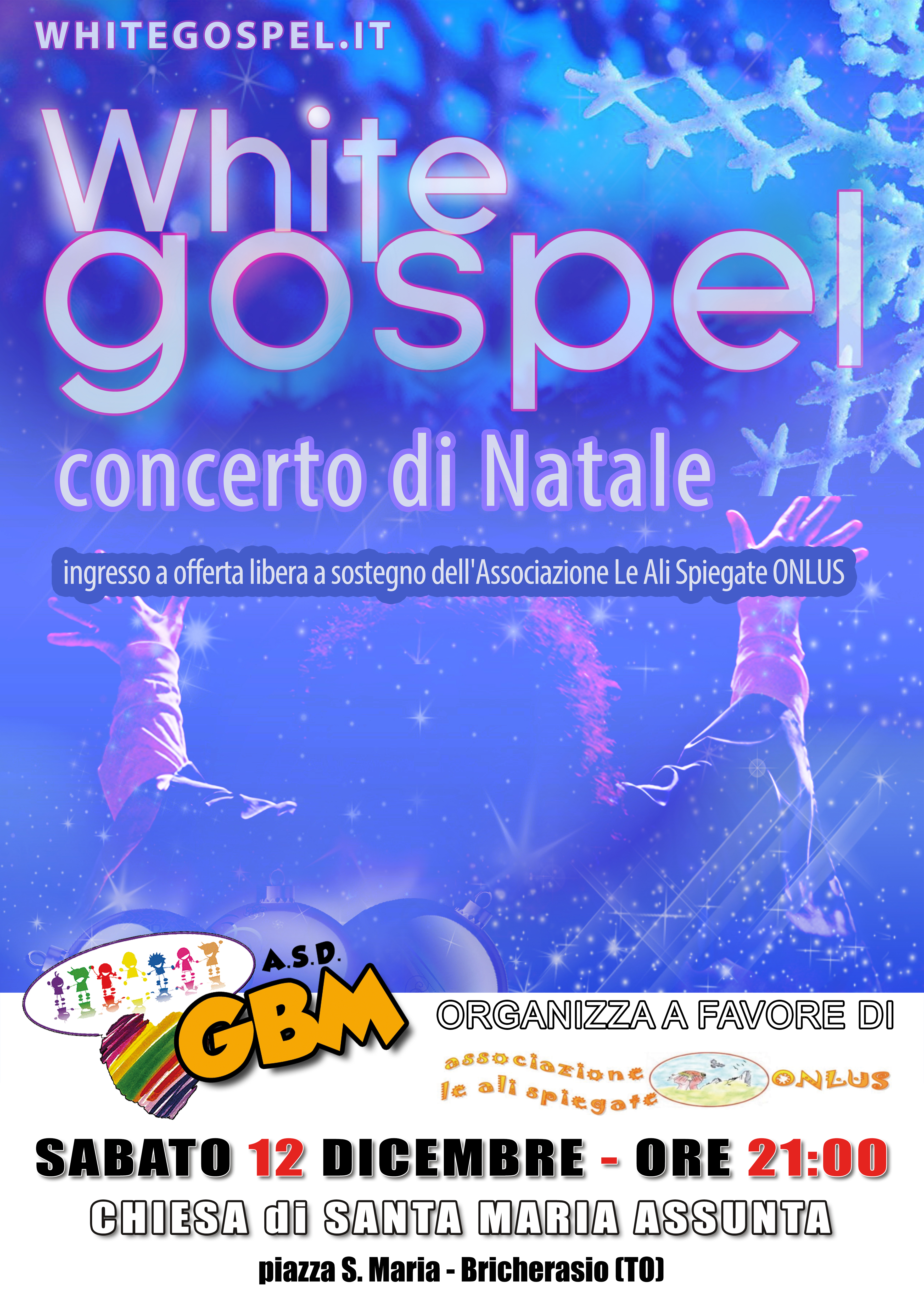 L’Associazione Giornata Benefica dei Motori di Bricherasio con il prezioso supporto di Don Ferdi, organizza per Sabato 12 dicembre alle ore 21.00 nella chiesa di Santa Maria a Bricherasio, un concerto del coro “White Gospel” a favore dell’associazione Le Ali Spiegate ONLUS di promozione sociale per la disabilità. L’Associazione Ali Spiegate promuove l’inclusione dei disabili nel tessuto sociale, con progetti volti a migliorare le loro capacità ed autonomie per il sostegno ai disabili nella tutela dei loro diritti, nella loro inclusione nel tessuto sociale, nell’abbattimento delle barriere architettoniche e nell’attuazione di progetti che offrano la possibilità di accrescere la loro abilità. Il coro nasce nel 1988 da un gruppo di ragazzi davanti alla chiesa di Leumann al termine della Messa e il mercoledì successivo una ventina di ragazzi, per gran parte a digiuno di qualsiasi esperienza musicale, stanno per diventare un coro. Un po’ di tentativi, qualche stecca, tante risate, poi improvvise arrivano le prime note insieme. Uniche. Bellissime. Sono la scintilla che accende la passione per questa musica straordinaria: il Gospel è entrato nell’anima, e non la abbandonerà più. Oggi The White Gospel Group conta 20 anni di attività musicale, e ogni mercoledì sera alle 21 si ritrova come la prima volta presso i locali messi a disposizione gratuitamente dal Comune di Grugliasco. L'ingresso è libero e le offerte libere raccolte durante la serata saranno devolute interamente alle Ali Spiegate e si invitano tutti a partecipare all’evento benefico. La manifestazione rientra nella diciassettesima edizione del Natale in allegria bricherasiese.
