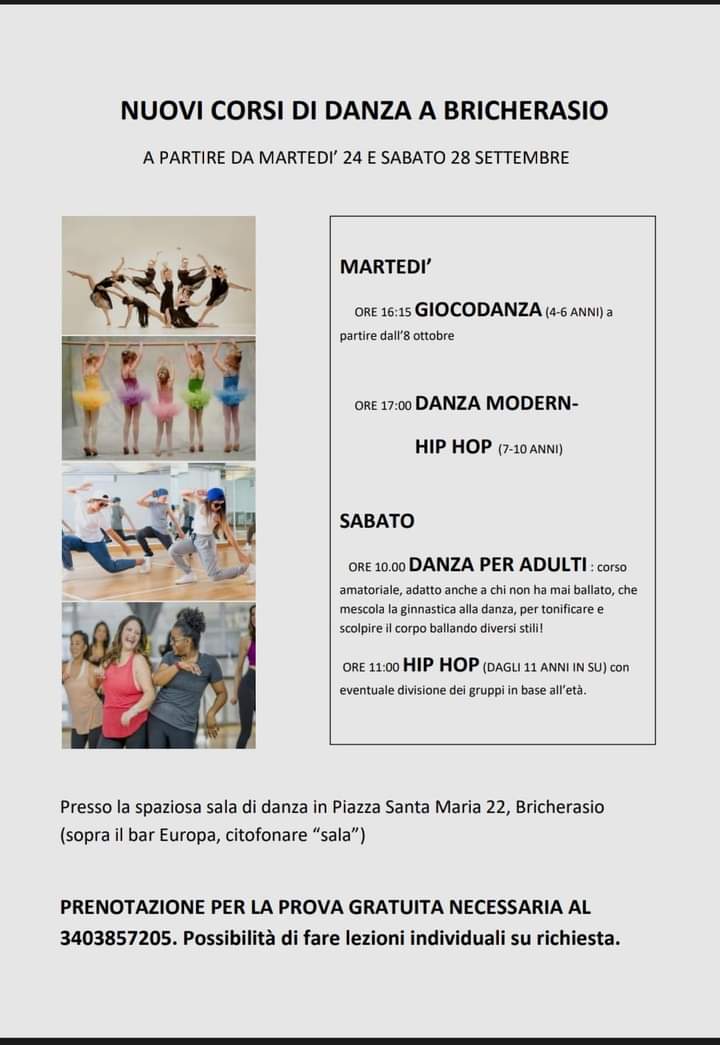 Martedì 8 ottobre prendono il via alle ore 16,15 per bambini dai 4 ai 6 anni, i corsi di gioco-danza e alle 17 quelli per adolescenti dai 7 ai 10 anni che si cimentano nella danza moderna e nell’hip hop. Per maggiori informazioni scrivere a sognidanzanti@libero.it oppure telefonare a Denise al 3403857205.