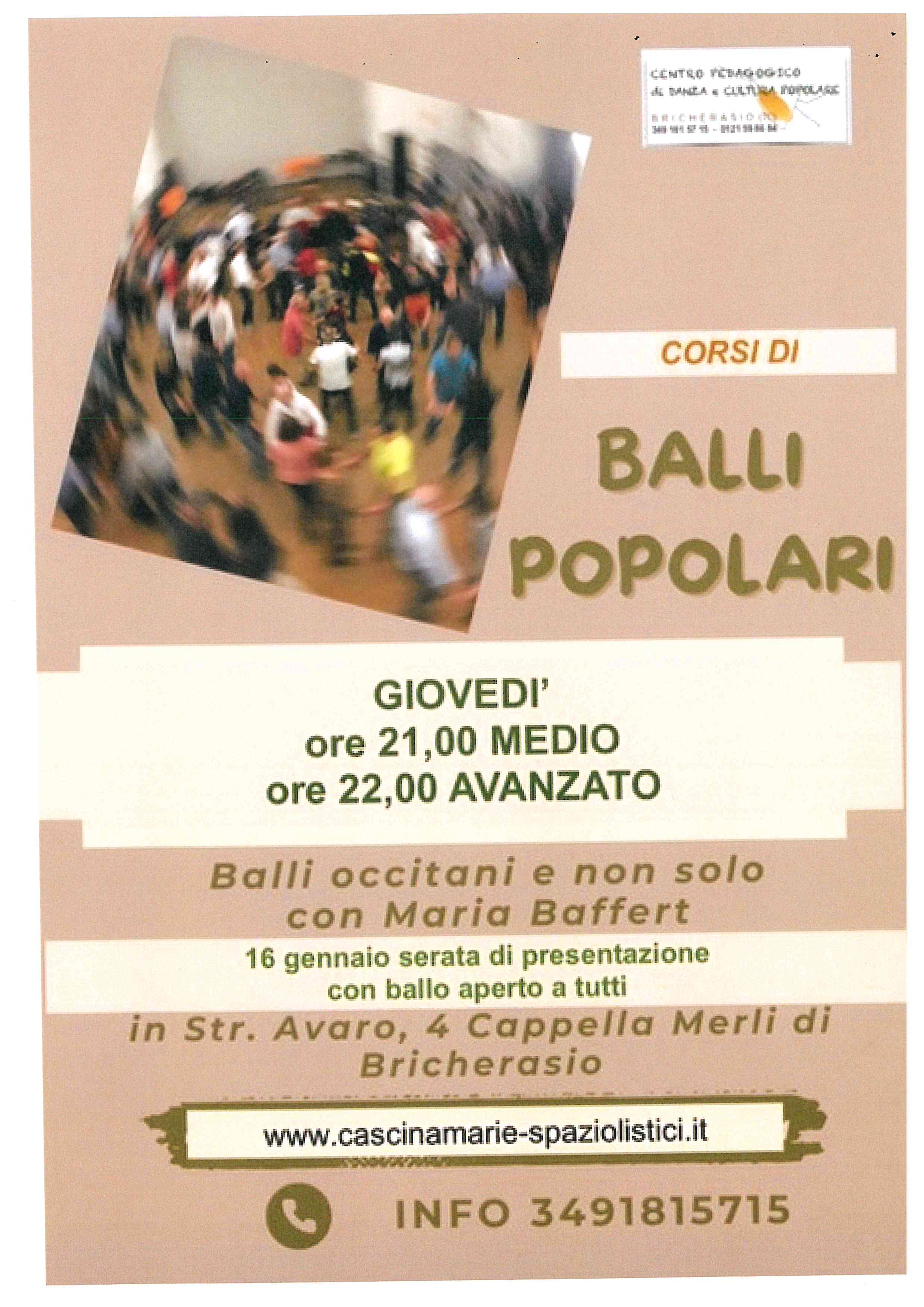 Giovedì 16 gennaio dalle ore 21 serata di presentazione del corso di balli popolari con la possibilità di ballare aperta a tutti al Centro Pedagogico di Danza e Cultura Popolare di Strada Avaro, 4 nella frazione di Cappella Merli a Bricherasio. Per maggiori informazioni consultare il sito www.cascinamarie-spaziolistici.it oppure telefonare a Maria Baffert al numero 3491815715.
