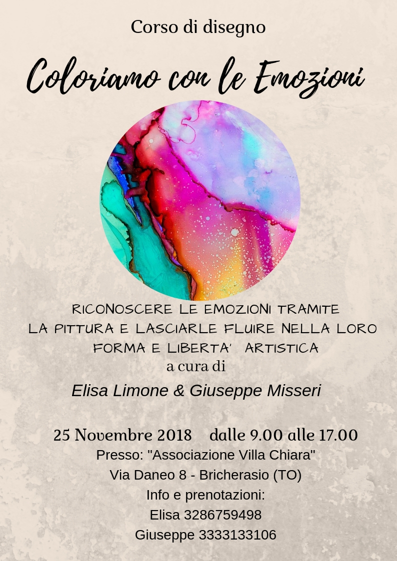 L’associazione Culturale Villa Chiara di Bricherasio dopo aver presentato a ottobre un incontro sulla floriterapia adesso organizza per Domenica 25 novembre dalle ore 9 alle 17 nella sede dell’Associazione in Via Daneo, 8 a Bricherasio il corso di disegno "Coloriamo le emozioni", per riconoscere le emozioni tramite la pittura e lasciarle fluire nella loro forma e libertà artistica. La giornata è curata da Elisa Limone e Giuseppe Misseri. L’ingresso è libero ad offerta fino ad esaurimento posti. Per ulteriori informazioni e per prenotazioni telefonare a Giuseppe al 333/3133106 oppure a Elisa al 328/6759498.
