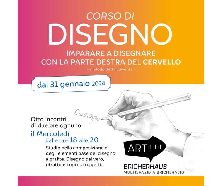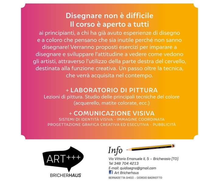 Il multispazio Art +++ Bricherhaus organizza a partire da mercoledì 31 gennaio e fino al 20 marzo nella propria sede di Via Vittorio Emanuele II 5 a Bricherasio un corso di disegno aperto a tutti con metodo Betty Edwards per imparare a disegnare con la parte destra del cervello. Gli incontri di due ore si svolgono il mercoledì dalle 18 alle 20 per uno studio della composizione degli elementi base del disegno a grafite con attenzione al ritratto, alla copia di oggetti ed al disegno dal vero.