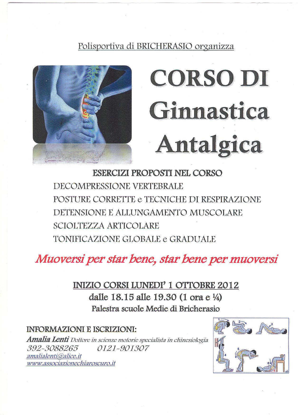 L’Associazione sportiva Bricherasio-Bibiana organizza un corso di ginnastica antalgica che si tiene nella palestra delle scuole medie di Bricherasio il lunedì dalle 18,15 alle 19,30 con inizio lunedì 1 ottobre. Vari gli esercizi proposti dalla decompressione vertebrale, alla detenzione e allungamento muscolare per la tonificazione globale e graduale. Come recita lo slogan muoversi per star bene significa stare bene per muoversi. Informazioni ed iscrizioni durante lo svolgimento del corso oppure al 392/3088265.