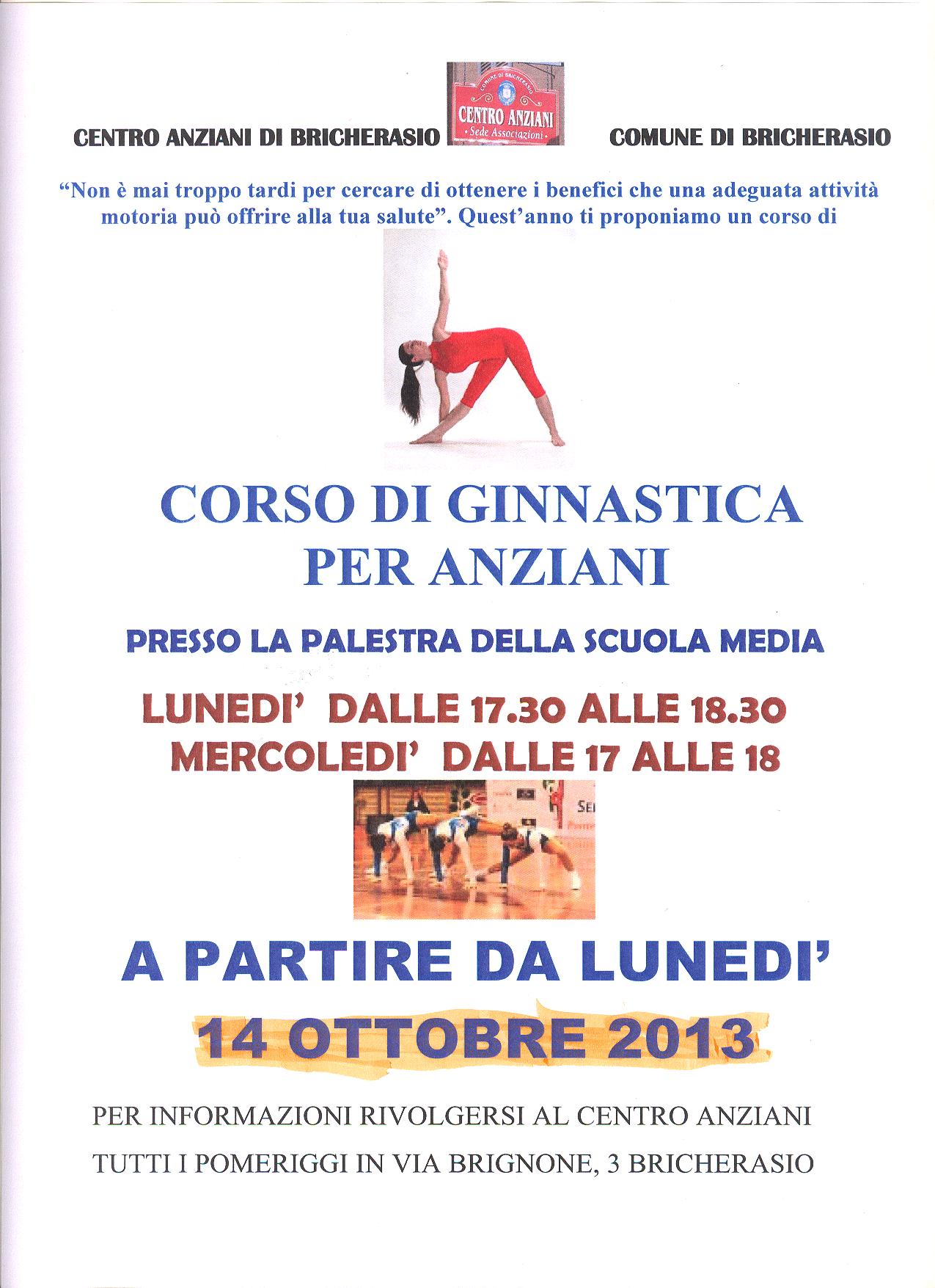 Il Centro Anziani di Bricherasio organizza il corso di ginnastica per anziani che si svolge nella palestra delle scuole medie il lunedì dalle 17,30 alle 18,30 e il mercoledì dalle 17 alle 18 a partire da lunedì 14 ottobre. Chi è interessato a partecipare e per informazioni rivolgersi tutti i pomeriggi, dalle ore 15,00 alle 18,00, presso il Centro Anziani di Via Brignone, 3 a Bricherasio.