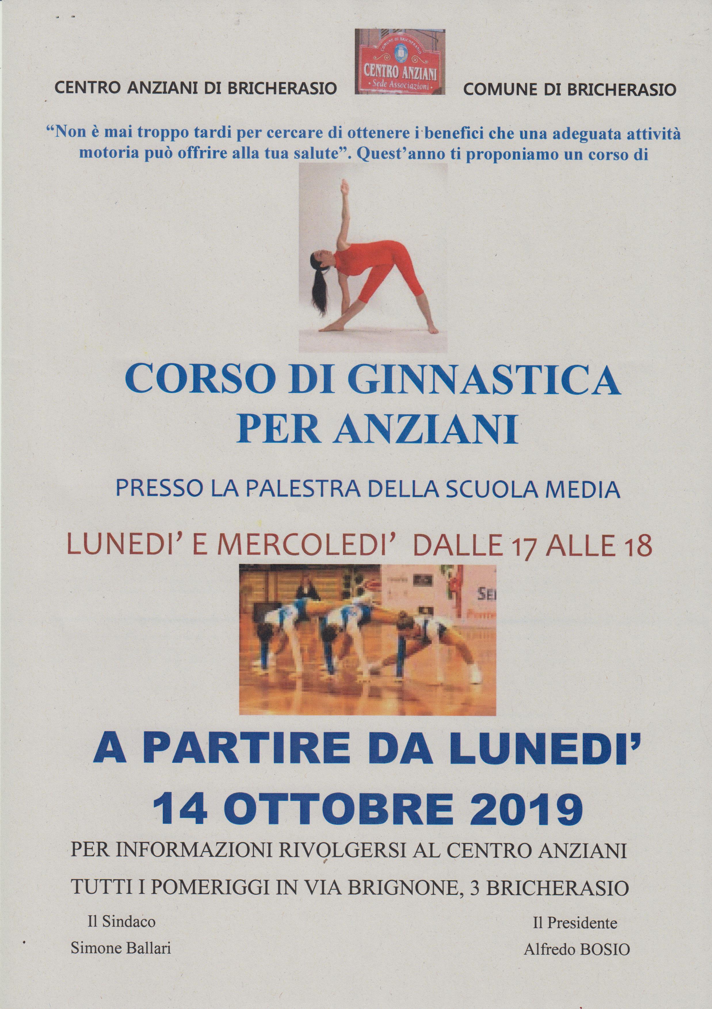 Il Centro Anziani di Bricherasio organizza il corso di ginnastica per anziani che si svolge nella palestra delle scuole medie il lunedì ed il mercoledì dalle 17 alle 18 a partire da lunedì 14 ottobre. Chi è interessato a partecipare e per informazioni rivolgersi tutti i pomeriggi, dalle ore 15,00 alle 18,00, presso il Centro Anziani di Via Brignone, 3 a Bricherasio.