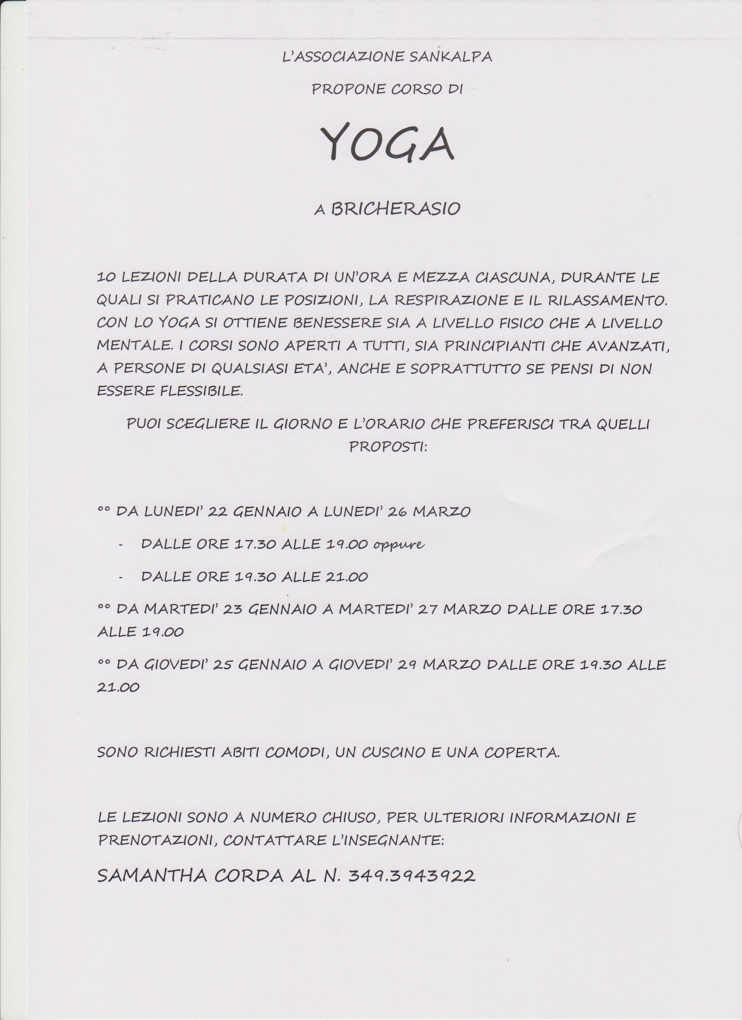 L’Associazione Sankalpa di Bricherasio propone un corso a numero chiuso di yoga articolato in dieci lezioni della durata di un’ora e mezza che iniziano lunedì 22 gennaio e si svolgono nelle ex scuole elementari della frazione Cappella Merli dalle 17,30 alle 19 e dalle 19,30 alle 21. Nata nel settembre del 2014 l’Associazione Sankalpa di Samantha Corda, si è inserita nel panorama delle associazioni bricherasiesi con umiltà e semplicità. “Adesso contiamo un centinaio di iscrizioni alle nostre attività che riguardano lo yoga, il reiki e la Floriterapia” esordisce cosi la titolare che poi continua “Per venire incontro alle esigenze dei partecipanti effettuiamo le lezioni anche il martedì dalle 17,30 alle 19 e il giovedì dalle 19,30 alle 21”. Il costo di partecipazione è di 75 € a cui vanno aggiunti 10 € per la tessera di affiliazione al CSEN. Ancora Samantha “Il corso è aperto a tutti, principianti ed esperti durante lo svolgimento si praticano tecniche di respirazione, di postura e di rilassamento”. Sono richiesti abiti comodi, tappetino cuscini e coperta e per ulteriori informazioni e per prenotazioni telefonare al 349-3943922 oppure inviare un email a samantha.corda@hotmail.it che poi conclude con orgoglio “Uno degli obiettivi della nostra Associazione è quello di rilanciare il circolo letterario atipico creato dalla Sankalpa dove ognuno porta la propria idea esponendola agli altri partecipanti. Il secondo lunedì di ogni mese ci troviamo alle ex scuole per parlare non solo di libri.”