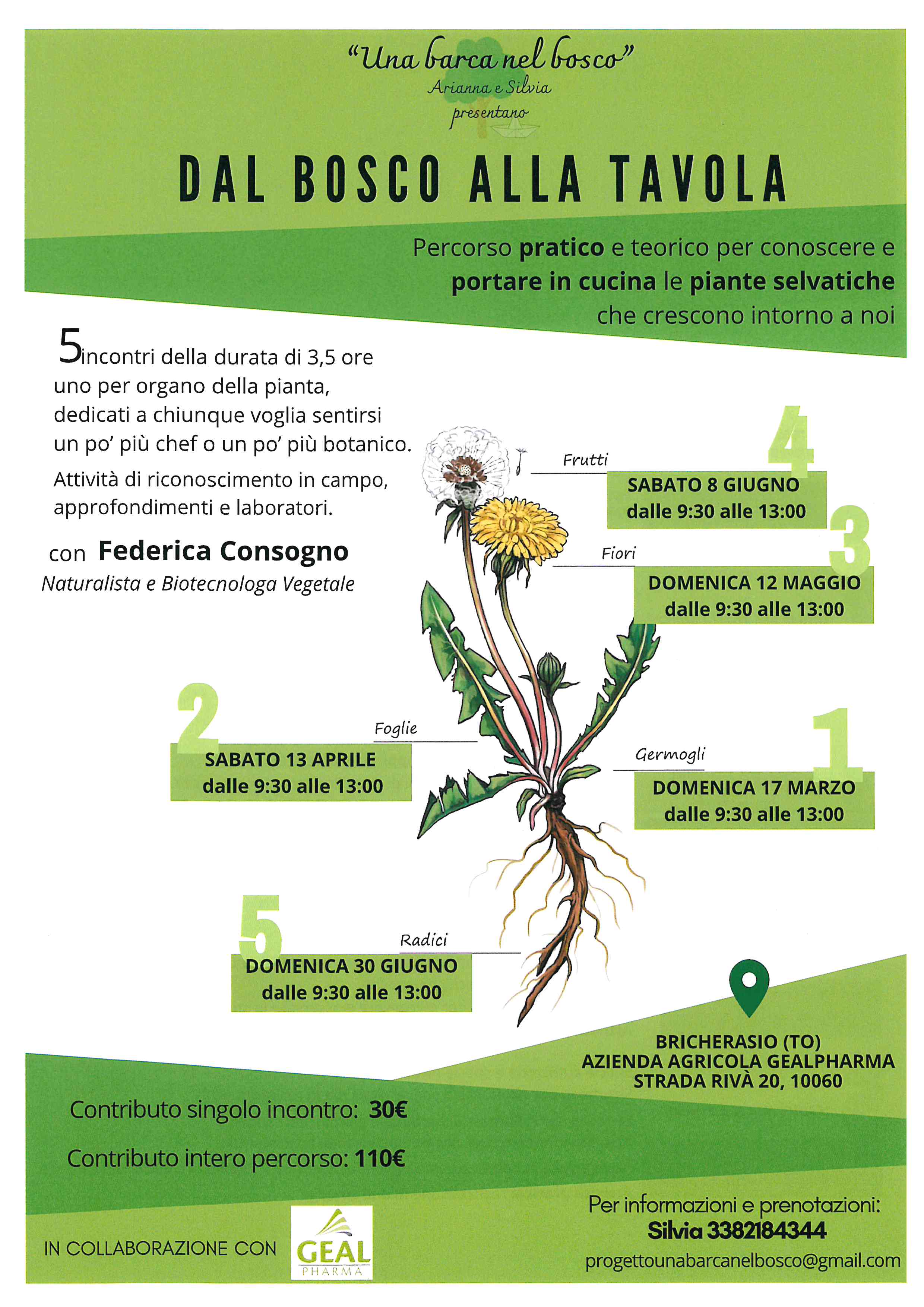 L'Azienda Agricola Geal Pharma (Strada Rivà 20 a Bricherasio) organizza cinque incontri in un percorso pratico e teorico per conoscere e portare in cucina le piante selvatiche che crescono intorno a noi. I ritrovi sono dedicati a chiunque voglia sentirsi un po' chef e un po' botanico con attività di riconoscimento in campo, approfondimenti e laboratori. Il progetto "Una barca nel bosco" comincia domenica 17 marzo e prosegue sabato 13 aprile, domenica 12 maggio, sabato 8 giugno e domenica 30 giugno. E' richiesto un contributo di 30 euro per ogni singolo evento . Per informazioni e prenotazioni scrivere a progetto una barcanelbosco@gmail.com oppure telefonare a Silvia al numero 3382184344.
