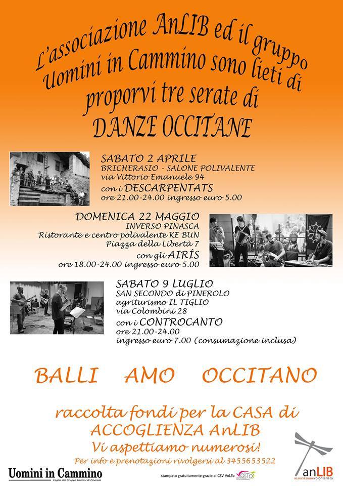 L'Associazione AnLIB ed il gruppo Uomini in cammino propongono per sabato 2 aprile (ore 21.00) una serata benefica di danze occitane con i "Descarpentats" al Salone Polivalente di Piazza Don Morero. Ingresso 5 euro.