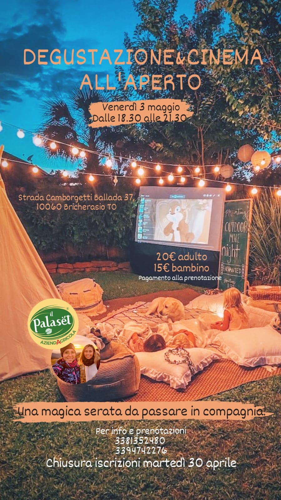 Continuano le attività sotto il Cas del Palaset, l’Azienda Agricola e Fattoria didattica di Strada Camborgetti Ballada, 37 a Bricherasio con nuove proposte, una degustazione e cinema all’aperto di venerdì 3 maggio dalle ore 18,30 alle 21,30 per le quali la chiusura delle iscrizioni è fissata a martedì 30 aprile. Per trascorrere una magica serata da passare in compagnia sono richiesti 20 € per gli adulti e 15 € ai bambini e per informazioni e prenotazioni chiamare il 3381352480 oppure 3394742276.