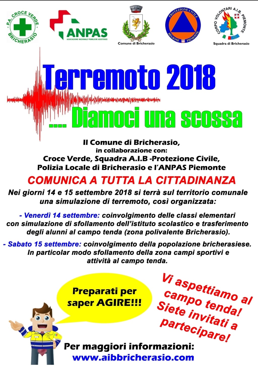 Il Comune di Bricherasio in collaborazione con la locale Croce Verde, la squadra AIB - Protezione Civile, la Polizia Municipale, il motoclub Edelweiss, la società ciclistica Brike Bike e il gruppo giovani dell'ANPAS Piemonte comunica a tutta la cittadinanza che venerdì 14 e sabato 15 settembre si terrà sul territorio comunale un'esercitazione generale di protezione civile, con simulazione di una scossa di terremoto. Si parte venerdì 14 con il coinvolgimento delle classi della scuola primaria con la simulazione di sfollamento dell'istituto scolastico e trasferimento degli alunni al campo tenda installato nella zona del Salone Polivalente di Piazza Don Morero. Dopo una prima scossa simulata ce ne sarà una seconda con successivi controlli, le residenze dichiarate inagibili e l'apertura del COC (Centro Operativo Comunale) con la segreteria per la registrazione degli sfollati e l'allestimento di una cucina da campo con tensostruttura per consumare i pasti. Il sabato si simuleranno altre due scosse di terremoto con le stesse modalità, coinvolgendo tutto il territorio comunale e organizzando in particolare lo sfollamento della zona residenziale nei pressi dei campi sportivi. L'esercitazione generale, una delle prime sul territorio regionale a coinvolgere anche la cittadinanza oltre agli addetti ai lavori, intende promuovere una visione partecipativa della protezione civile e della prevenzione.