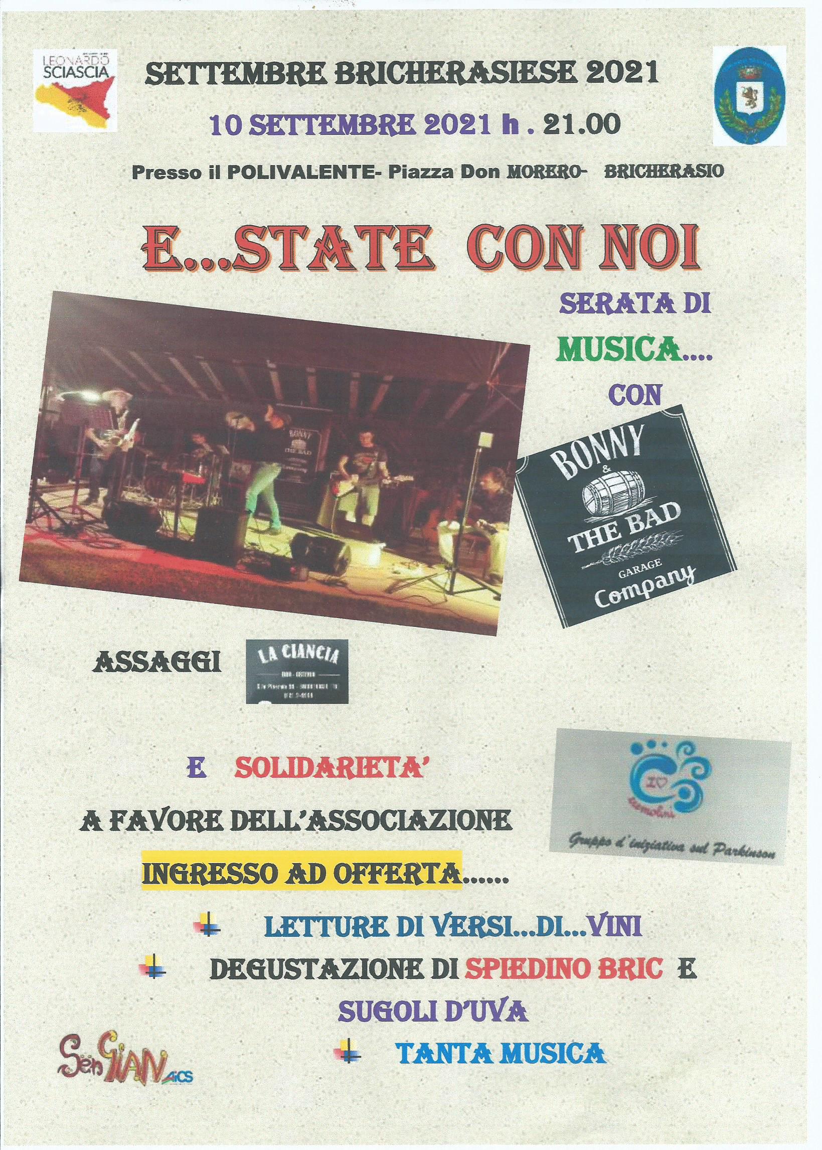 Venerdì 10 settembre a partire con inizio alle ore 21, all'interno della 53^ Sagra dell’Uva di Bricherasio l’Associazione Leonardo Sciascia presenta “E…state con noi", serata musicale con Bonny the bad al Salone Polivalente. Ingresso libero con prenotazione obbligatoria e green pass. Maggiori informazioni al numero 338/4537003.