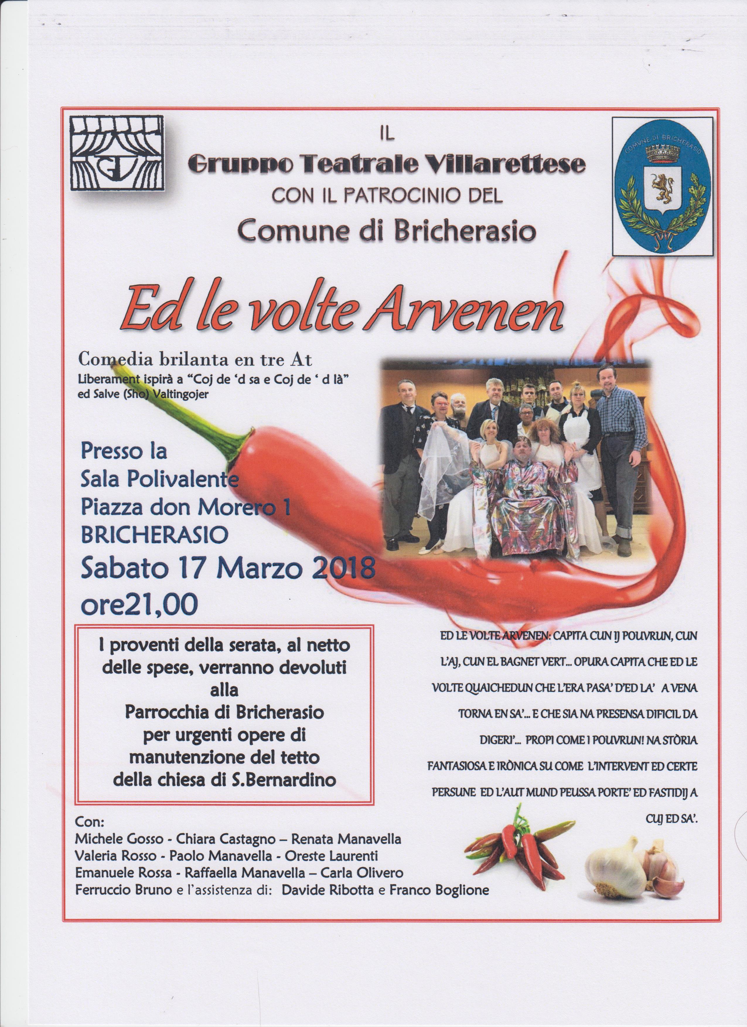 Sabato 17 marzo alle ore 21 nel Salone Polivalente di Piazza Don Morero a Bricherasio rappresentazione della commedia brillante piemontese in tre atti del Gruppo Teatro Villarettese dal titolo "Ed le volte Arvenen!" liberamente ispirata a "Coj de 'd sa e coj d là". Con Michele Gosso - Chiara Castagno – Renata Manavella Valeria Rosso - Paolo Manavella - Oreste Laurenti Emanuele Rossa - Raffaella Manavella – Carla Olivero Ferruccio Bruno e l’assistenza di: Davide Ribotta e Franco Boglione. CAPITA CUN IJ POUVRUN, CUN L’AJ, CUN EL BAGNET VERT… OPURA CAPITA CHE ED LE VOLTE QUAICHEDUN CHE L’ERA PASA’ D’ED LA’ A VENA TORNA EN SA’… E CHE SIA NA PRESENSA DIFICIL DA DIGERI’… PROPI COME I POUVRUN! NA STÒRIA FANTASIOSA E IRÒNICA SU COME L’INTERVENT ED CERTE PERSUNE ED L’AUT MUND PEUSSA PORTE’ ED FASTIDIJ A CUJ ED SA’. I proventi della serata verranno devoluti alla Parrocchia di Bricherasio per urgenti opere di manutenzione del tetto della chiesa di San Bernardino