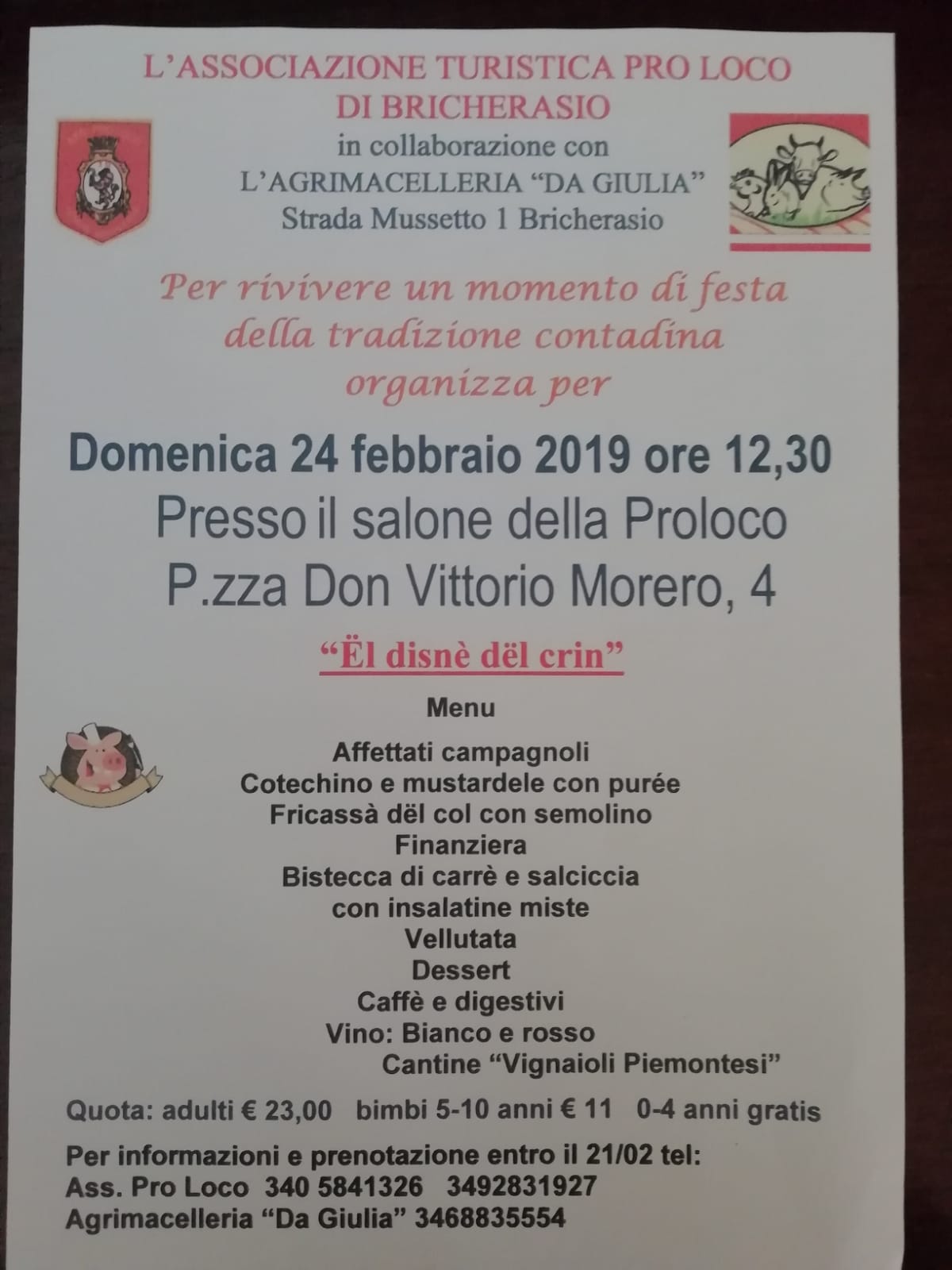 La Pro Loco di Bricherasio per rivivere una festa della tradizione contadina organizza, in collaborazione con l’Agrimacelleria “Da Giulia” di Strada Mussetto, 1 a Bricherasio, per Domenica 24 febbraio alle ore 12,30 nel Salone della Pro Loco di Piazza Don Morero, 4 “El disnè del crin”. La quota di partecipazione per gli adulti è di 23,00 € per i bambini dai 5 ai 10 anni di 11,00 €. Per informazioni e prenotazioni telefonare entro giovedì 21 febbraio ai numeri 340/5841326, 349/2831927 oppure 346/8835554. Inoltre la Pro Loco ricorda che nelle domeniche del mese di febbraio e marzo è possibile rinnovare il tesseramento UNPLI e Proloco per l'anno 2019 dalle ore 9,30 alle 12 all’Ufficio Turistico di Piazza Santa Maria.