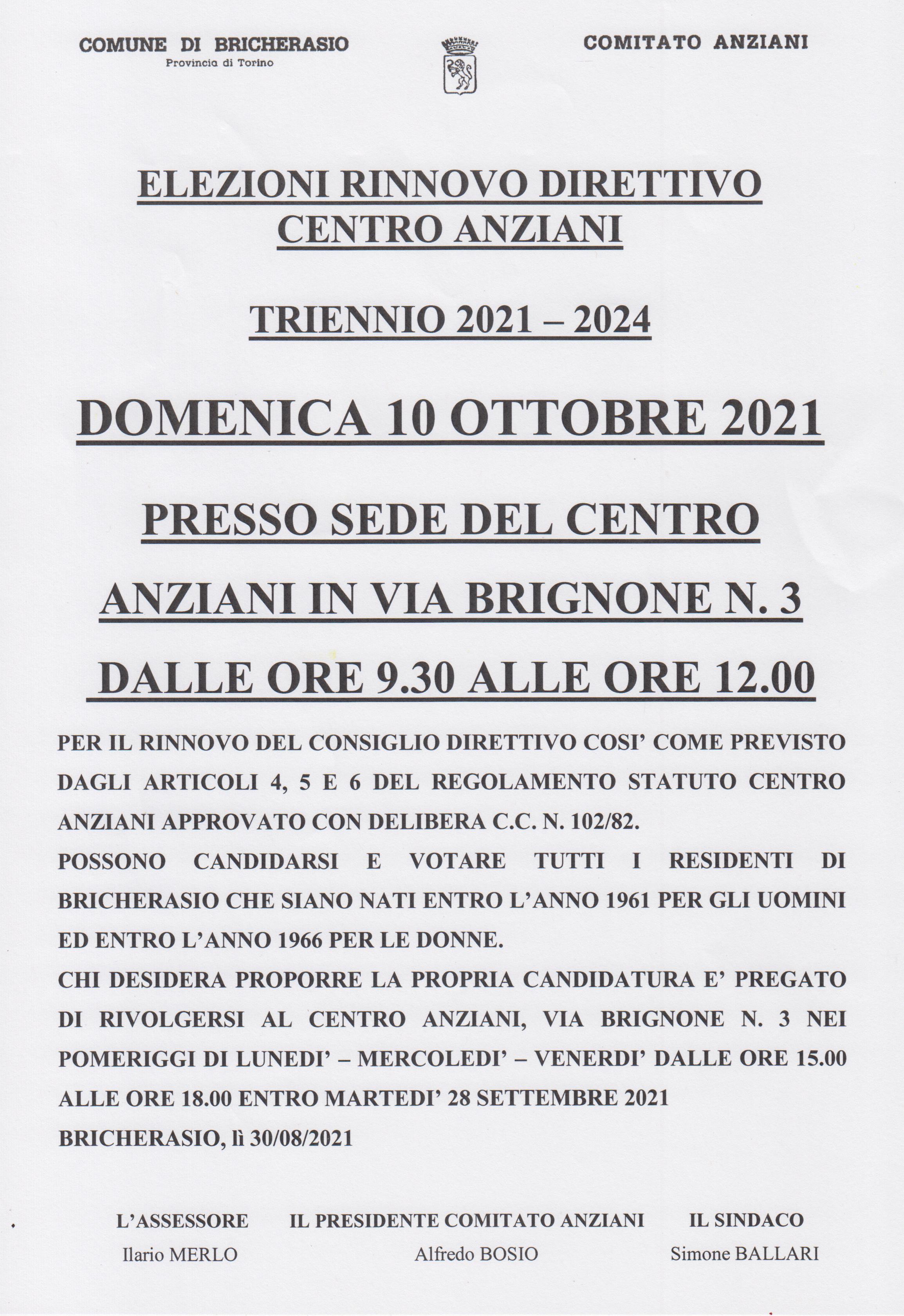 Il Centro Anziani di Bricherasio rinnova il proprio direttivo per il triennio 2021/2024 con le elezioni di Domenica 10 ottobre. Alla sede di Via Brignone, 3 dalle ore 9,30 alle 12 tutti possono presentarsi alle urne e votare solo i residenti di Bricherasio che siano nati entro il 1961 per gli uomini ed entro il 1966 per le donne. Per maggiori informazioni rivolgersi in sede.