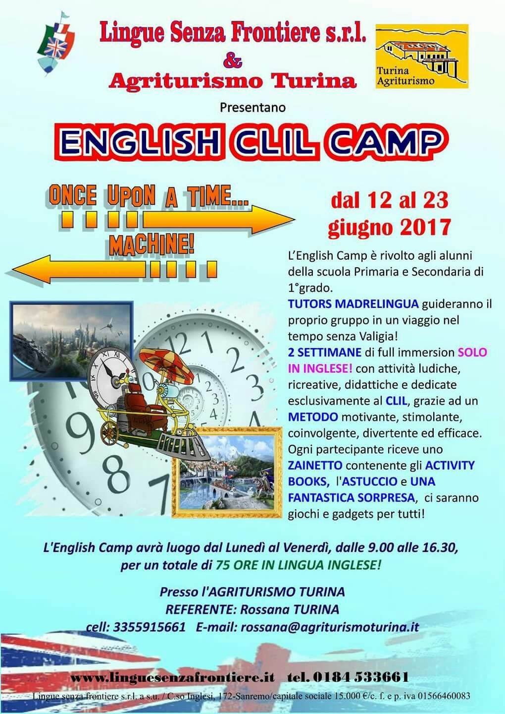 Scadono mercoledì 10 maggio le iscrizioni all'English Clil Camp, organizzato dall’agriturismo Turina di Bricherasio in collaborazione con Lingue senza frontiere. Il corso di inglese Clil, acronimo di Content and Language Integrated Learning, ovvero "apprendimento integrato in lingua straniera” è rivolto agli alunni delle scuole primaria e secondaria di primo grado, e si terrà da lunedì 12 a venerdì 23 giugno presso il medesimo agriturismo bricherasiese, in Strada Tagliarea, 16. I ragazzi saranno seguiti da Tutors madrelingua, che guideranno i partecipanti in giro per il mondo per un viaggio senza valigia. I docenti CLIL, in possesso di competenze linguistico-comunicative nella lingua straniera di livello, seguiranno gli studenti, durante l'arco dei dieci giorni di full immersion, dal lunedì al venerdì dalle ore 9 alle 16,30, proponendo attività ludiche, didattiche, creative e ricreative con un metodo motivante, stimolante, coinvolgente e divertente. Ogni partecipante riceverà uno zainetto contenente gli activity books, un astuccio e una sorpresa, oltre a gadgets per tutti i partecipanti. Maggiori informazioni da Rossana Turina al numero 335-5915661.