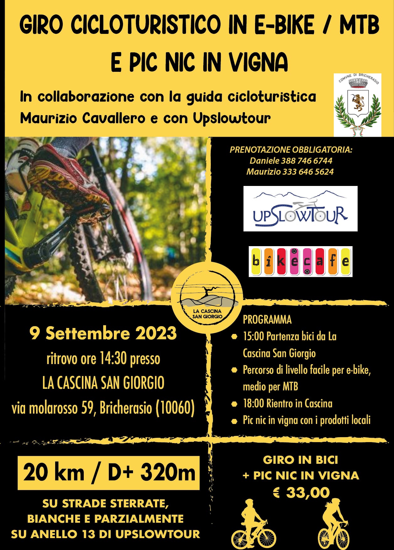 Sabato 9 a partire dalle 14,30 la guida Maurizio Cavallero, accompagnatore cicloturistico della Regione Piemonte, in collaborazione con UpSlowtour, assiste i partecipanti all‘escursione in mountain bike, prima della cena alla Cascina San Giorgio, dove c'è il ritrovo per la pedalata. Partenza alle ore 15 per un percorso di livello facile per e-bike e media difficoltà per le mountain bike. Alle 18 previstso il rientro per il pic-nic in vigna con prodotti locali al costo è di 33 €. prenostazioni obbligatorie da Maurizio al numero 333/6465624 oppure da Daniele al 388/7466744.