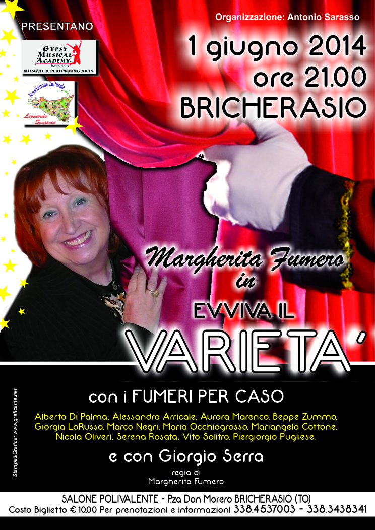 Per la PRIMA volta sul Palco del POLIVALENTE di BRICHERASIO -TO ... DOMENICA 1 GIUGNO 2014 h. 21 ... grande serata con ..... I FUMERI PER CASO regia e con Margherita FUMERO e i suoi artisti che vi stupiranno con un nuovissimo ed ESCLUSIVO spettacolo dalla commedia alla comicità e non solo.... intitolato " EVVIVA IL VARIETA' " .