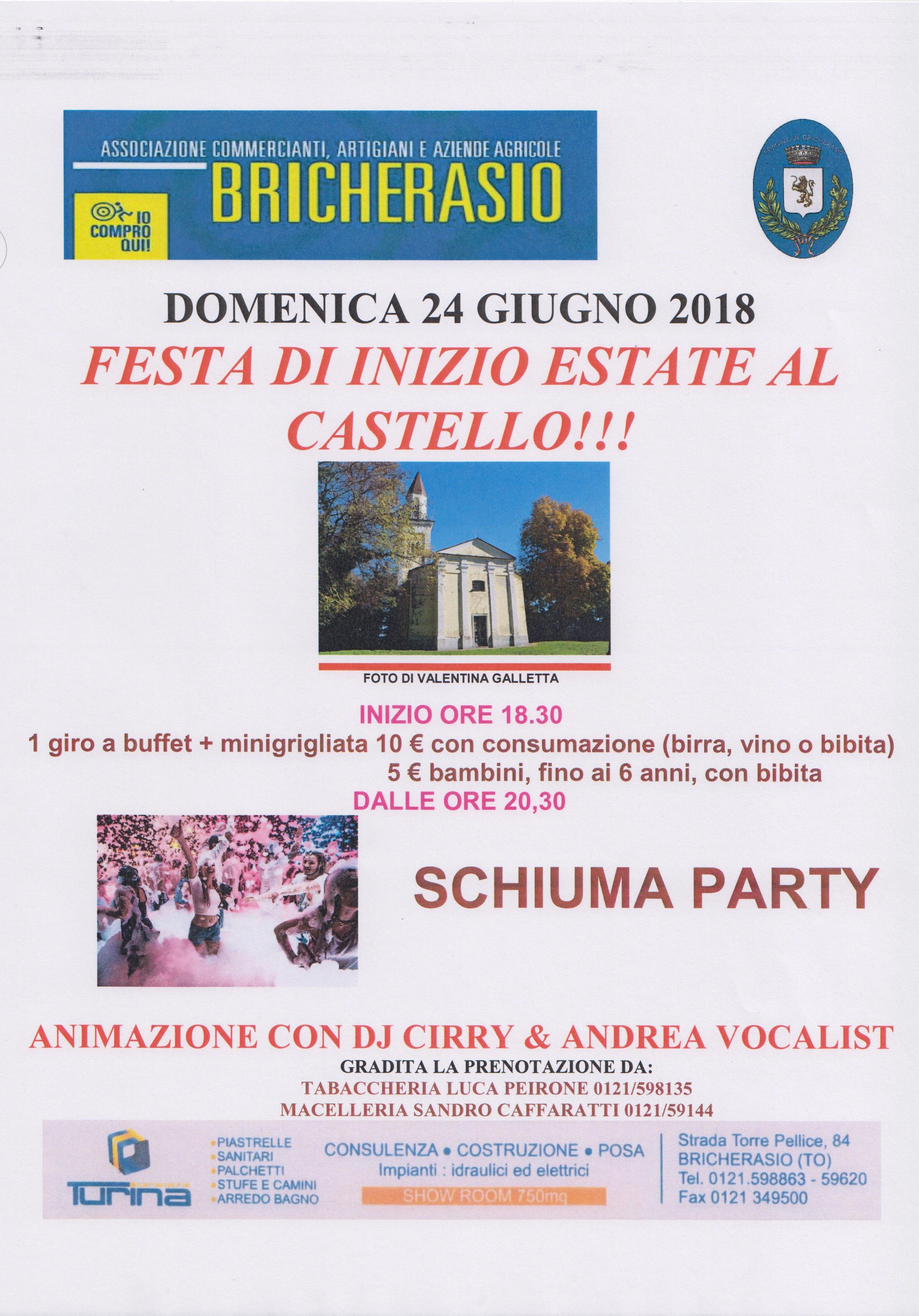 L'Associazione Commercianti artigiani e aziende agricole di Bricherasio organizza la festa di inizio estate con musica e balli con il dj Cirry e Andrea vocalist che animeranno il Castello del paese a partire dalle ore 18,30 di domenica 29 luglio. “Finalmente il caldo inizia a farsi sentire e noi ci stiamo organizzando per la festa di inizio estate con prodotti locali, birra, spritz accompagnati da musica e tanto divertimento” esordisce il vice Presidente dei commercianti bricherasiesi Drin Caffaratti. “Il nostro progetto è quello di affiancare l’offerta turistica con appuntamenti culinari di grande qualità, aggiunge Caffaratti, le ore del tramonto nei giorni più lunghi dell’anno che aprono l’estate accoglieranno il pubblico negli spazi meravigliosi del Castello". Un giro a buffet più minigrigliata a 10 € con consumazione (birra, vino o bibita) e 5 € per i bambini, fino ai 6 anni, con bibita. Dalle 20.30 la prima edizione dello Schiuma Party. E' gradita la prenotazione alla tabaccheria Peirone allo 0121-598135 oppure alla Macelleria Caffaratti al numero 0121-59144. Ancora Caffaratti ”La rinnovata Associazione Commercianti, Artigiani e Aziende Agricole di Bricherasio in questi mesi di lavoro ha fatto cose straordinarie. Siamo come l’araba fenice che rinasce dalle proprie ceneri. Due anni fa dopo l’organizzazione della rassegna “Botteghe in piazza” del 2 giugno e l'Apericena sotto le stelle al Castello in occasione della 48^ Sagra dell'Uva nel quale sono stati raccolti e donati 500 € alle popolazioni terremotate per l'acquisto di una roulotte, non ci siamo fermati”. “La lotteria di Natale denominata ’Acquista a Bricherasio e vinci’ è stata un enorme successo con un incremento di vendite importante per gli esercizi che hanno aderito”.