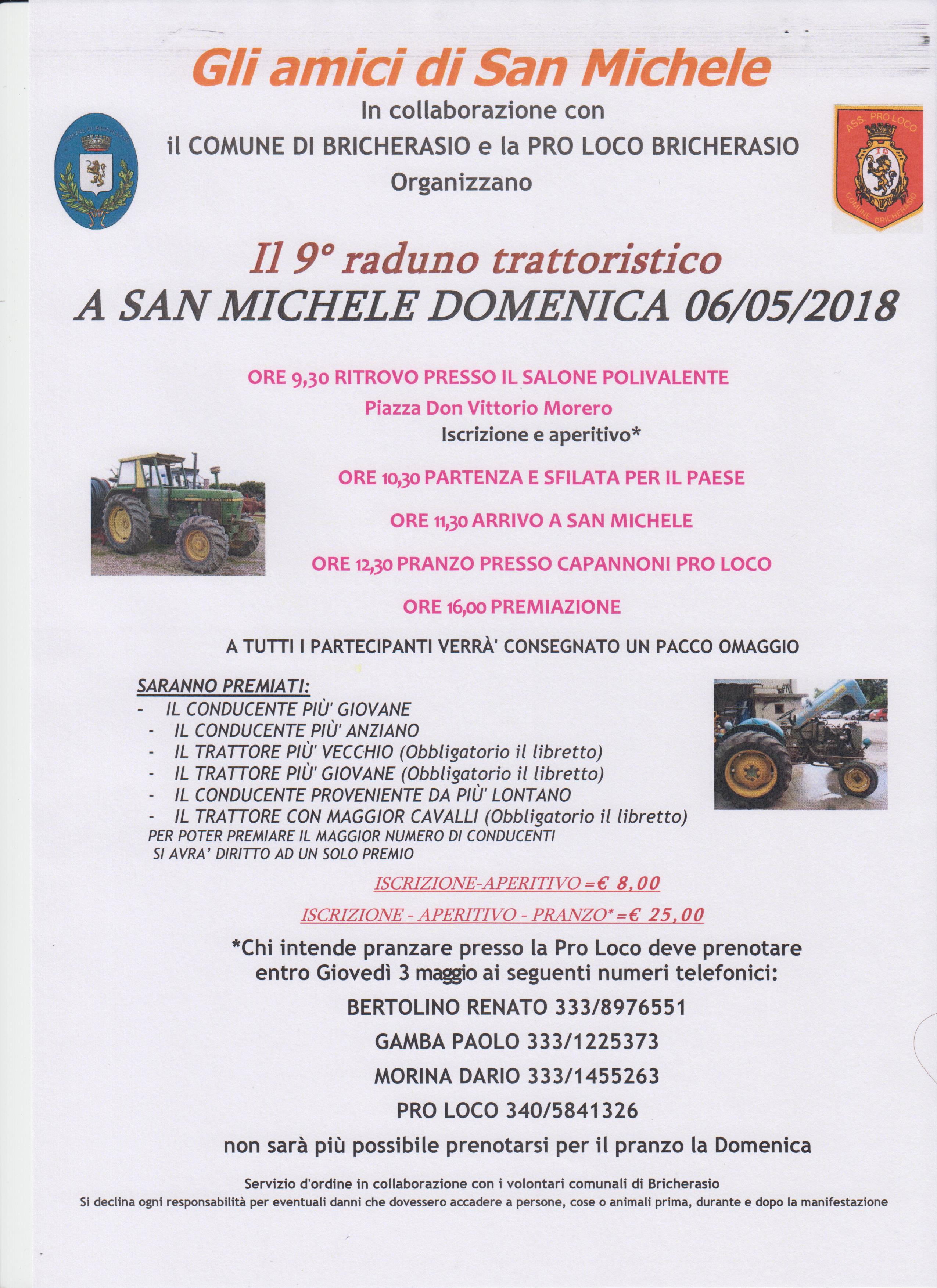 Domenica 6 maggio nella frazione di San Michele di Bricherasio si svolge la tradizionale Festa di Primavera con il 9° Raduno Trattoristico, il ritrovo dei quad e l’immancabile grande grigliata organizzata da sempre dall’Associazione Pro Loco di Bricherasio in collaborazione con gli "Amici di San Michele". Il programma prevede il ritrovo dei quad alle ore 9 nel piazzale di San Michele e quello dei trattori alle 9,30 al Salone Polivalente di Piazza Don Morero per l’iscrizione e l’aperitivo. Alle 10,30 la partenza e la sfilata per il paese dei mezzi agricoli. Alle 11,30 l’arrivo a San Michele per il pranzo campagnolo che si effettuerà alle 12,30 su prenotazione e con qualsiasi condizioni di tempo dato che si svolgerà sotto i capannoni della Pro Loco. Per iscriversi al convivio telefonare (entro giovedì 3 maggio, perché non sarà più possibile prenotarsi direttamente la domenica solo per il pranzo) all’ "eminenza grigia" dell’evento Renato Bertolino 333/8976551, a Paolo Gamba 333/1225373, al consigliere comunale Dario Morina 333/1455263 oppure alla Pro Loco 340/5841326. Per l’iscrizione al raduno trattoristico con l’aperitivo il costo è di 8,00 €, con il pranzo il prezzo è di 25,00 €. Alle ore 16 la ricca premiazione con consegna di un pacco omaggio ai partecipanti al raduno e di ulteriori ricnoscimenti per il conducente più giovane, il meno giovane, il trattore più vecchio e quello più giovane, chi proviene da più lontano e il mezzo con maggior potenza in cavalli fiscali.