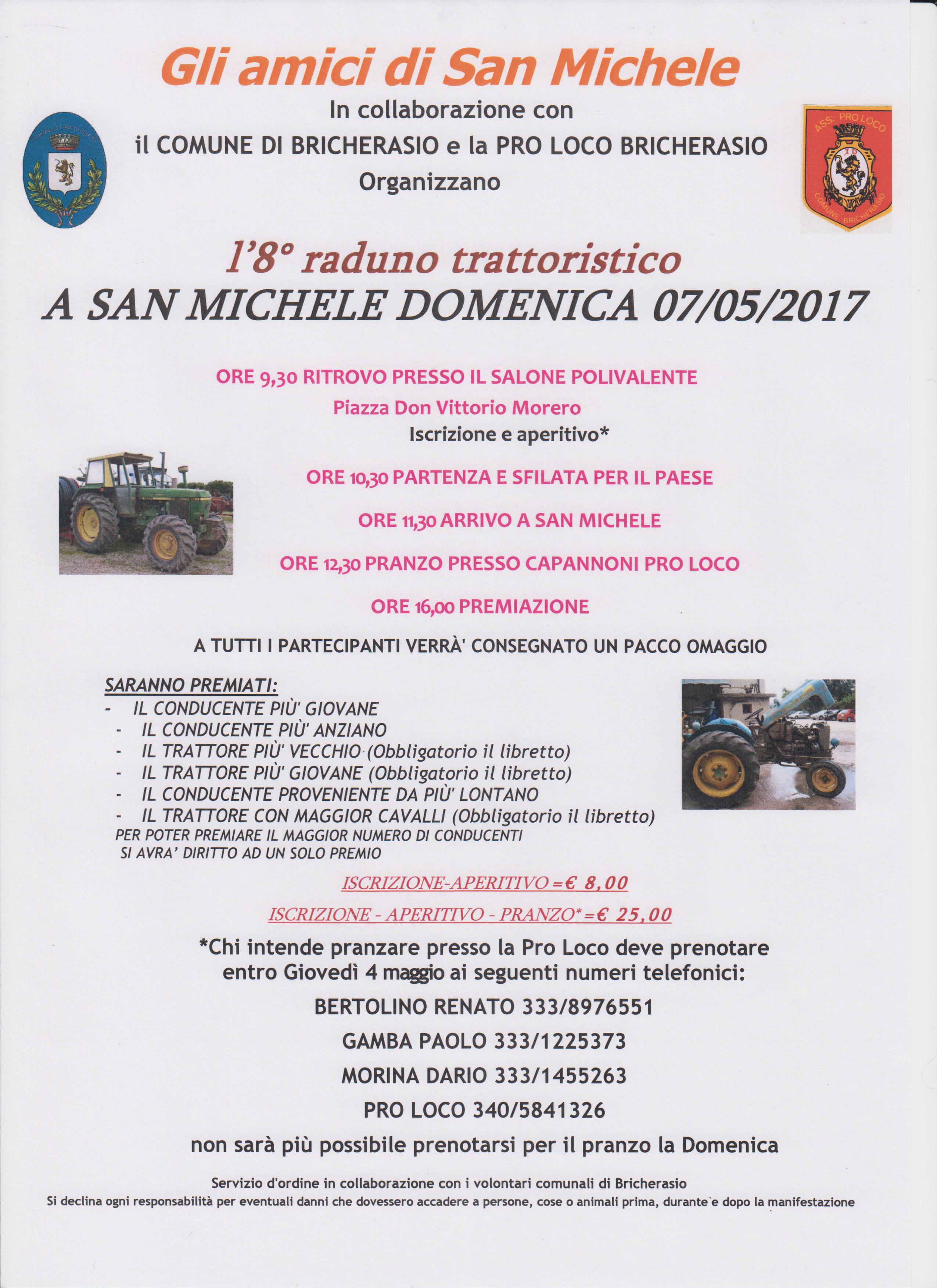 Bricherasio, tra le sue tante peculiarità, è nota anche per la sua festa di primavera, nella frazione di San Michele sempre prevista agli inizi di maggio, quando le temperature aumentano e i primi alberi sono in fiore. La Pro Loco di Bricherasio in collaborazione con Gli amici di San Michele organizzano infatti per Domenica 7 maggio nella frazione di San Michele di Bricherasio la popolare e tradizionale Festa di Primavera con l’ottavo Raduno Trattoristico, il ritrovo dei quad e l’immancabile grande grigliata. Il programma prevede il ritrovo dei quad alle ore 9,00 presso il piazzale di San Michele e quello dei trattori alle 9,30 presso il Salone Polivalente di Piazza Don Morero per l’iscrizione e l’aperitivo. Alle 10,30 la partenza e la sfilata per il paese dei trattori. Alle 11,30 l’arrivo a San Michele per il pranzo campagnolo che si effettuerà su prenotazione e con qualsiasi condizioni di tempo dato che si svolgerà sotto i capannoni della Pro Loco. Per iscriversi al convivio telefonare entro giovedì 4 maggio ai numeri di Renato Bertolino 333/8976551, di Paolo Gamba 333/1225373 oppure alla Pro Loco al 340/5841326. Per l’iscrizione al raduno trattoristico con l’aperitivo il costo è di € 8,00, con il pranzo il prezzo è di 25,00 € entro giovedì 5 perché non sarà più possibile prenotarsi la Domenica solo per mangiare. Alle ore 16 la ricca premiazione dei partecipanti al raduno dove a tutti verrà consegnato un pacco omaggio e saranno gratificati ulteriormente il conducente più giovane, il meno giovane, il trattore più anziano e quello più giovane, chi proviene da più lontano e il mezzo con maggior potenza in cavalli fiscali deducibile dal libretto.