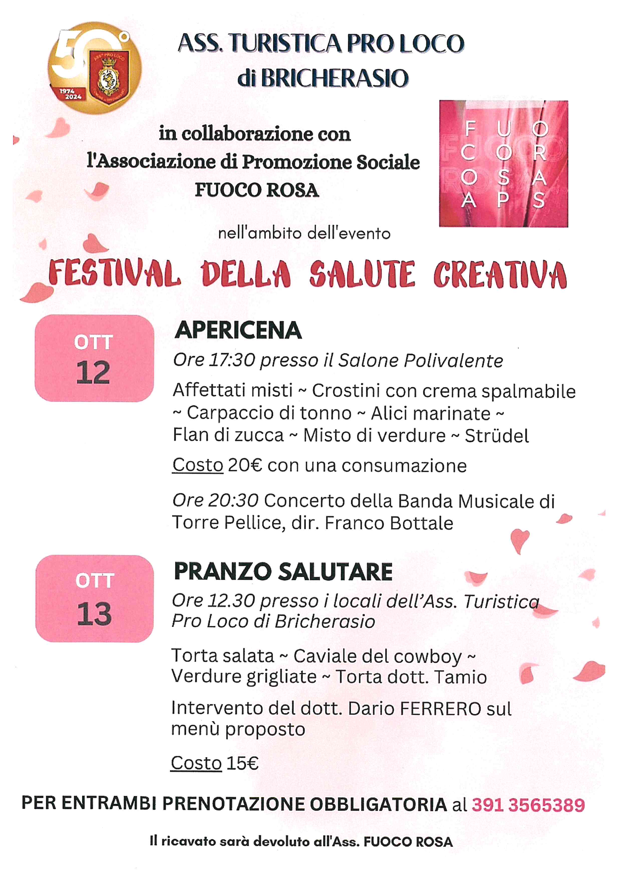 Dopo il grande riscontro di partecipanti nel maggio dello scorso anno viene riproposto a Bricherasio, con la seconda edizione il Festival della salute creativa a cura dell'Associazione di Promozione Sociale Fuoco Rosa in collaborazione di altre numerosi associazioni che coinvolge gli interessati per il weekend del 12 e 13 ottobre al Salone Polivalente di Piazza Don Morero, 2. Conferenze, attività, laboratori, medicina, salute, attività fisica e molto altro ancora per trascorrere un piacevole fine settimana. Abbinata all’evento la lotteria con dieci premi tra i quali quadri, weekend di relax, cene e percorsi benessere. Il programma denso di appuntamenti inizia sabato 12 alle ore 15,30 con la partenza della passeggiata canina in collaborazione con il canile di Bibiana che raccoglie le prenotazioni telefonando allo 012159040 e fornisce il cane a chi ne fosse sprovvisto. Partecipare alla camminata costa 10 € ad animale. Alle 16 iniziano i convegni, il primo in programma riguarda proprio gli amici a quattro zampe con la Dottoressa Emanuela Morello che illustra come amare e curare gli animali e alle ore 16,45 Annalisa Gregoretti, Educatrice cinofila dell’Associazione “De Lupis” di Saluzzo svolge la sua lezione a sei zampe. Alle 17,30 apericena a cura della Pro Loco di Bricherasio sempre al Salone Polivalente al costo di 20 € con consumazione e per prenotarsi occorre telefonare al 3913565389. La sera dalle 20,30 concerto della Banda Musicale Cittadina di Torre Pellice, diretta dal Maestro Franco Bottale. Domenica 13 le attività cominciano alle ore 8,45 con l’apertura dell’evento e la presentazione dell’Associazione Fuoco Rosa e proseguono dalle 9,15 con le spiegazioni di cosa è un tumore a cura del Dott. Galizia dell’Ospedale SS Annunziata di Savigliano. Alle 9,45 il Dott. Toesca dell’Istituto Ricerca sul Cancro di Candiolo parla della rete oncologica e le nuove tecniche di prevenzione e cura con la chirurgia non invasiva e dalle 10,30 si discute con il Dottor Rustichelli dell’agopuntura in oncologia. Alle 11,15 ultimo incontro della ricca mattinata a cura del Dott. Ferrero che spiega l’alimentazione corretta per prevenire il tumore mammario e alle 12,15 il pranzo salutare a 15 € con intervento del Dott. Ferrero sul menù proposto. Nel pomeriggio a partire dalle 14 all’aperto si svolge il cerchio della comunicazione a cura di Denise Nicola, Formatrice di comunicazione NCV mentre alle 15 spazio al reiki di Renata Manavella che illustra la sinergia con l’aromaterapia. A conclusione dell’evento alle ore 16 suoneranno le campane tibetane di Sebastiano Accossato in un massaggio sonoro. Nella sala B del Salone Polivalente alle 14,15 la consulente d’immagine Alessandra Canelli nel suo spazio spiega cosa indossare e alle 15 dimostrazione di agopuntura del Dottor Rustichelli. Dalle 15,45 inizia la dimostrazione di Estetica oncologica dello studio Estetica e Benessere di Bagnolo Piemonte mentre alle ore 16,30 si discute di capelli con Parrucche Somà di Saluzzo e per chiudere l’estrazione dei premi della lotteria prevista alle 17,30. La partecipazione agli eventi in programma è gratuita e per le attività pomeridiane è consigliata la prenotazione telefonica al 3913565389 via What App indicando nome, numero di partecipanti e tema d’interesse. Il festival serve a conoscere e scegliere liberamente e l’obiettivo della giornata è sapere cosa è bene per noi nel sentirci in salute anche se nella malattia. Mettendo un seme per conoscersi, sperimentando cosa vuol dire con le caratteristiche per stare in salute. Siamo tutti diversi ma il desiderio di stare in salute accomuna tutti, e questo weekend vuole porgere una mano e dare un’ opportunità per provare a stare bene.