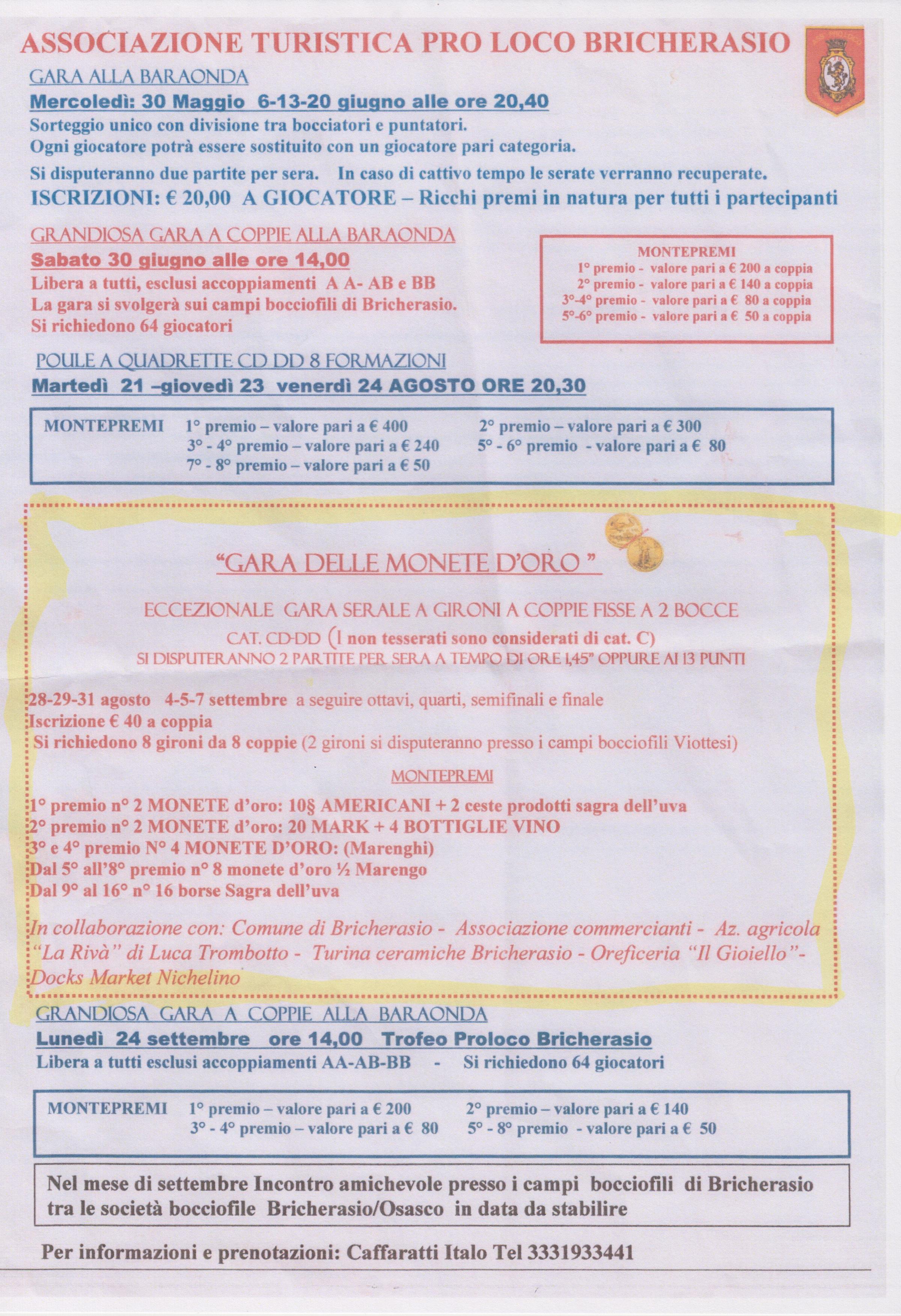 All'interno della 50^ Sagra dell'Uva bricherasiese prima edizione della "Gara a bocce delle monete d'oro", eccezionale sfida serale a gironi a coppie fisse a 2 bocce (cat. CD-DD) ai campi bocciofili comunali di Piazza Santa Maria che parte martedì 28 agosto alle 20.30. Le partite proseguono mercoledì 29, venerdì 31 agosto e la settimana successiva martedì 4, mercoledì 5 e venerdì 7 settembre.