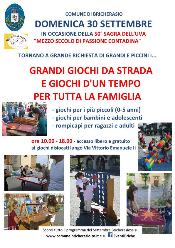 Il Comune di Bricherasio, nell'ambito della 50^ edizione della Sagra dell'Uva propone per Domenica 30 settembre, a partire dalle ore 10, i grandi giochi da strada e giochi di un tempo per tutta la famiglia, con accesso libero e gratuito. I giochi, suddivisi per fasce d'età, partendo dagli 0-5 anni e fino ai rompicapo per ragazzi ed adulti, saranno dislocati lungo Via Vittorio Emanuele II.