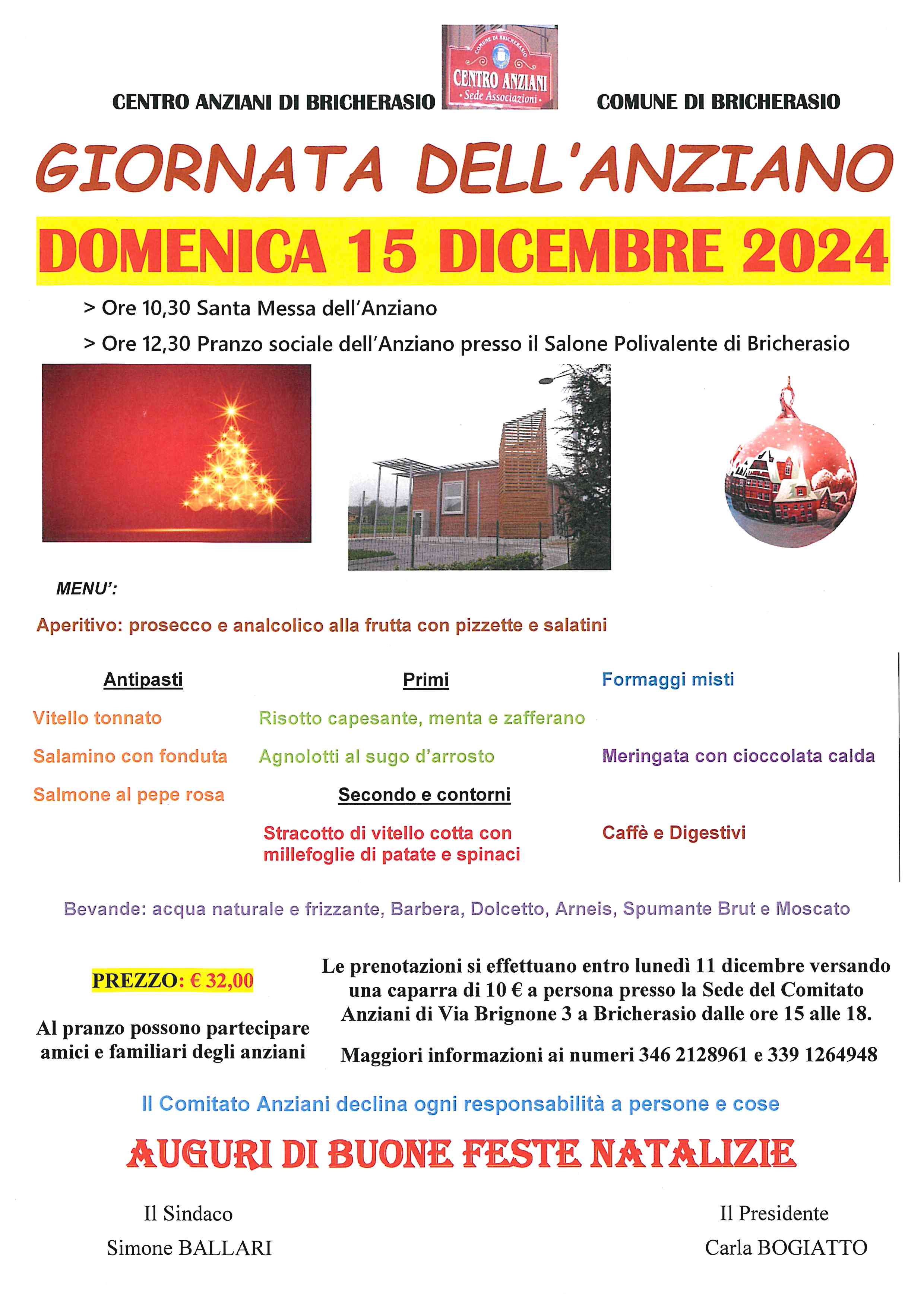 Il Comitato Anziani di Bricherasio, in collaborazione con il Comune, organizza la giornata dell’Anziano per Domenica 15 dicembre con il seguente programma: alle ore 10,30 la Santa Messa e alle 12,30 il pranzo sociale dell’Anziano al Salone Polivalente di Bricherasio di Piazza Don Morero, 2. Il prezzo è stabilito in € 32 e le prenotazioni si effettuano entro lunedì 9 dicembre versando una caparra di € 10 alla sede del Centro Anziani di Via Brignone, 3. Maggiori informazioni ai numeri 3462128961 oppure 3391264948. Augurando buone feste l’Associazione ricorda che al pranzo possono partecipare amici e familiari degli anziani. La manifestazione rientra nei festeggiamenti del Natale a Bricherasio.