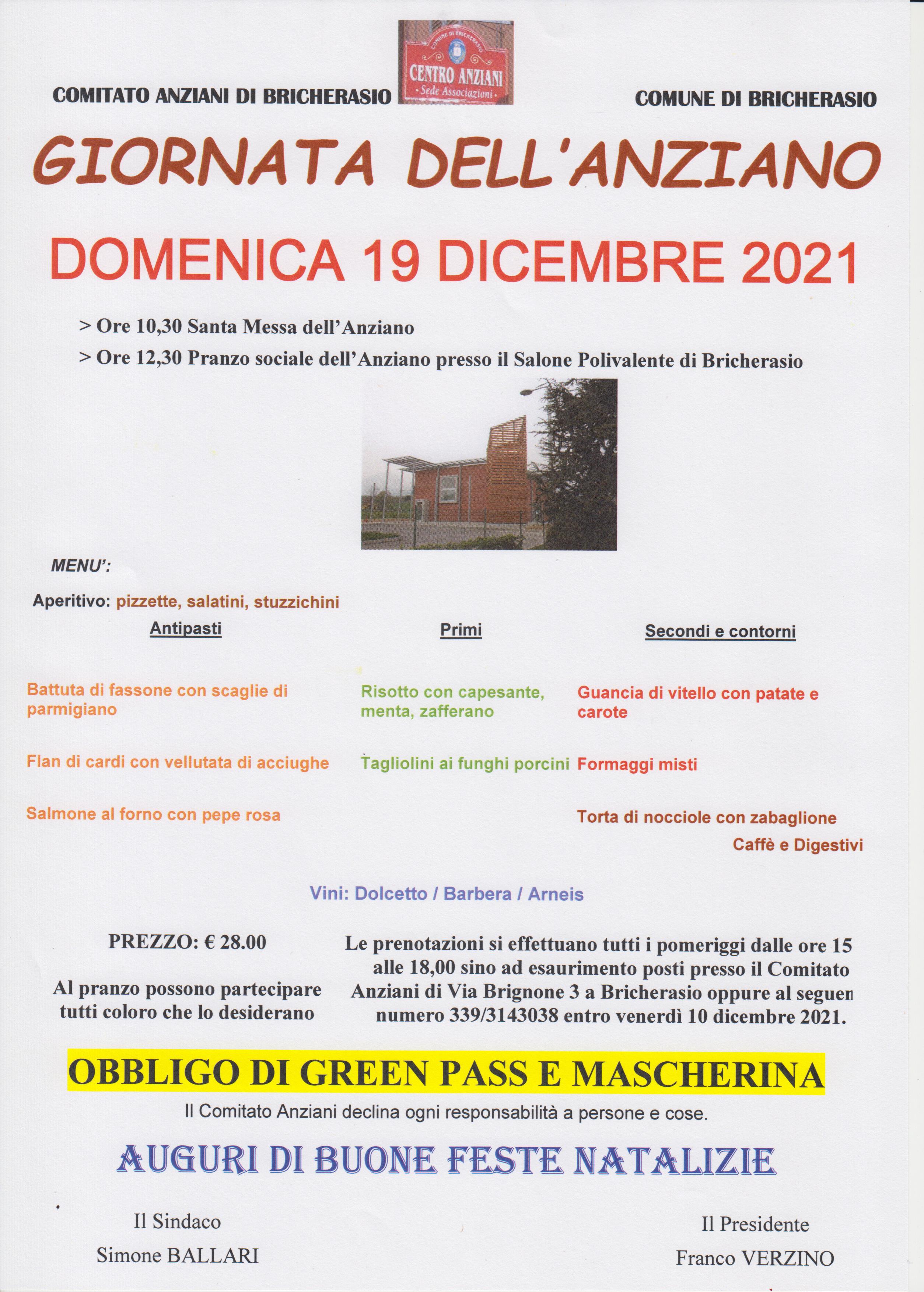 Il Comitato Anziani di Bricherasio, in collaborazione con il Comune, organizza la giornata dell’Anziano per Domenica 19 dicembre con il seguente programma: alle ore 10,30 la Santa Messa e alle 12,30 il pranzo sociale dell’Anziano al Salone Polivalente di Bricherasio di Piazza Don Morero. Il prezzo è stabilito in € 28,00 e comprende aperitivo, tre antipasti, due primi piatti, secondo di carne con contorni, formaggi, dolce, caffè e digestivi, il tutto innaffiato dai vini locali. Informazioni e prenotazioni fino ad esaurimento dei posti disponibili tutti i pomeriggi, dalle ore 15,00 alle 18,00, al Centro Anziani di Via Brignone, 3 entro venerdì 10 dicembre. Al pranzo possono partecipare amici e familiari degli anziani. Si ricorda l’obbligo di presentazione del green pass e della mascherina.