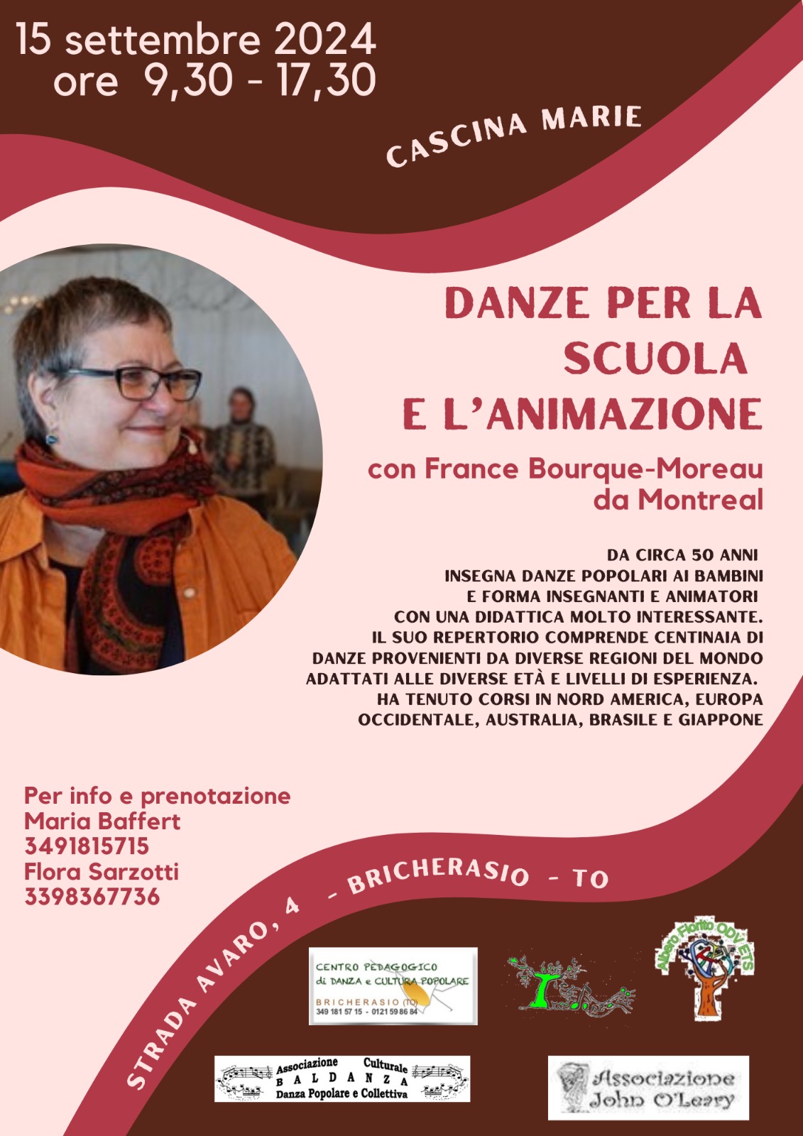 Cascine Marie in Strada Avaro, 4 nella frazione Cappella Merli di Bricherasio propone per Domenica 15 settembre dalle ore 9,30 alle 17,30 una giornata di Danze per la scuola e l’animazione con France Borque-Moreau da Montreal. L’artista canadese insegna danze popolari ai bambini e forma insegnanti e animatori da circa 50 anni con una didattica particolare molto interessante. Il suo repertorio comprende centinaia di danze provenienti da diverse regioni del mondo adattate alle diverse età e livelli di esperienza. Per maggiori informazioni e prenotazioni telefonare a Maria Baffert al numero 3491815715 oppure a Flora Sarzotti al 3398367736.