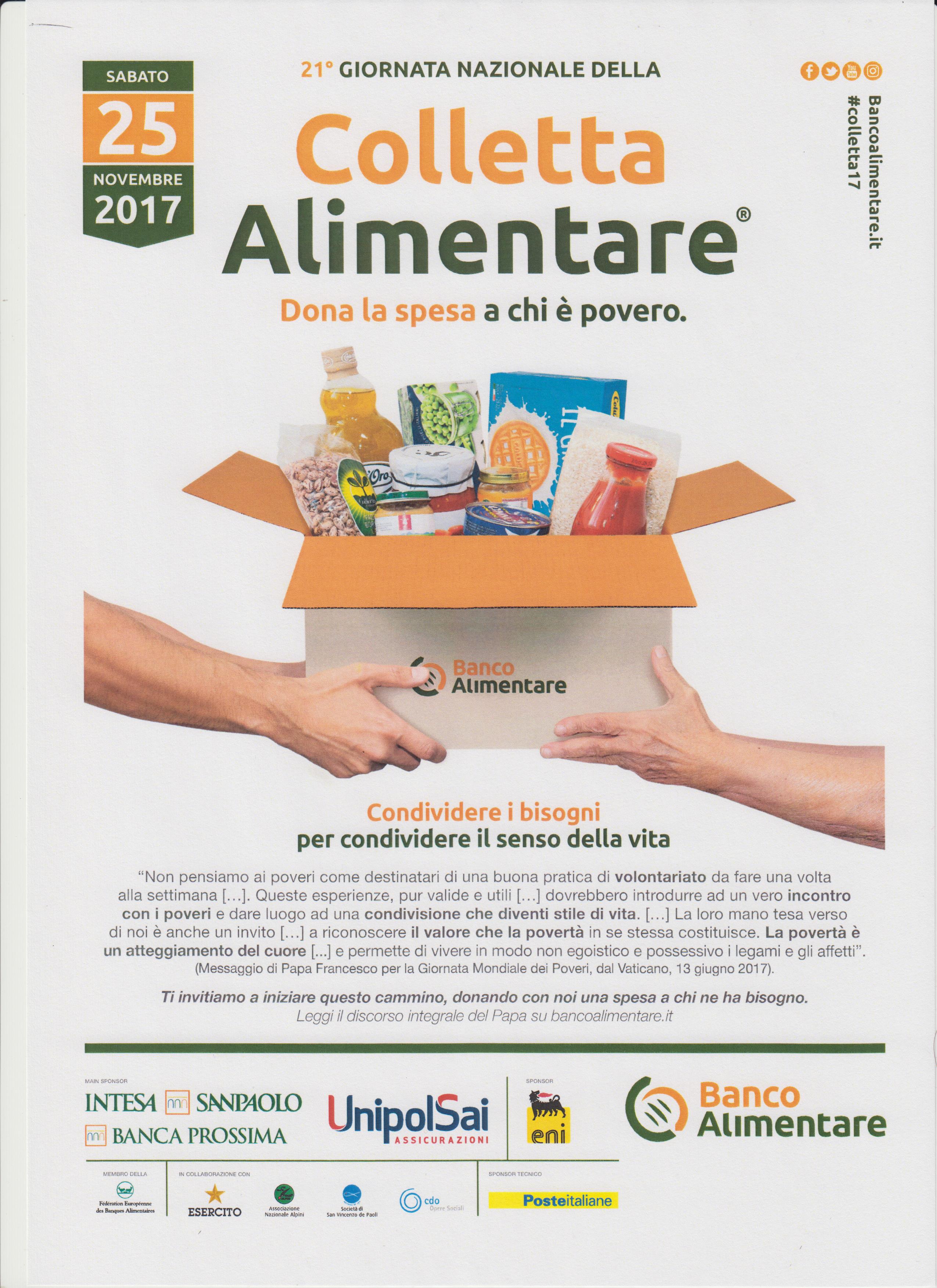 Ti invitiamo a iniziare il cammino di solidarietà, donando una spesa a chi ne ha bisogno: SABATO 25 NOVEMBRE 2017, presso una fittissima rete di supermercati aderenti su tutto il territorio nazionale e a Bricherasio presso i supermercati MD e IN'S con i volontari degli alpini e dell'Oratorio, ciascuno può donare parte della propria spesa per rispondere al bisogno di quanti vivono nella povertà. Anche tu puoi farlo! “Non pensiamo ai poveri come destinatari di una buona pratica di volontariato da fare una volta alla settimana [...]. Queste esperienze, pur valide e utili [...] Dovrebbero introdurre ad un vero incontro con i poveri e dare luogo ad una condivisione che diventi stile di vita. [...] La loro mano tesa verso di noi è anche un invito [...] A riconoscere il valore che la povertà in se stessa costituisce. La povertà è un atteggiamento del cuore [...] E permette di vivere in modo non egoistico e possessivo i legami e gli affetti”. - Messaggio di Papa Francesco per la Giornata Mondiale dei Poveri, dal Vaticano, 13 giugno 2017