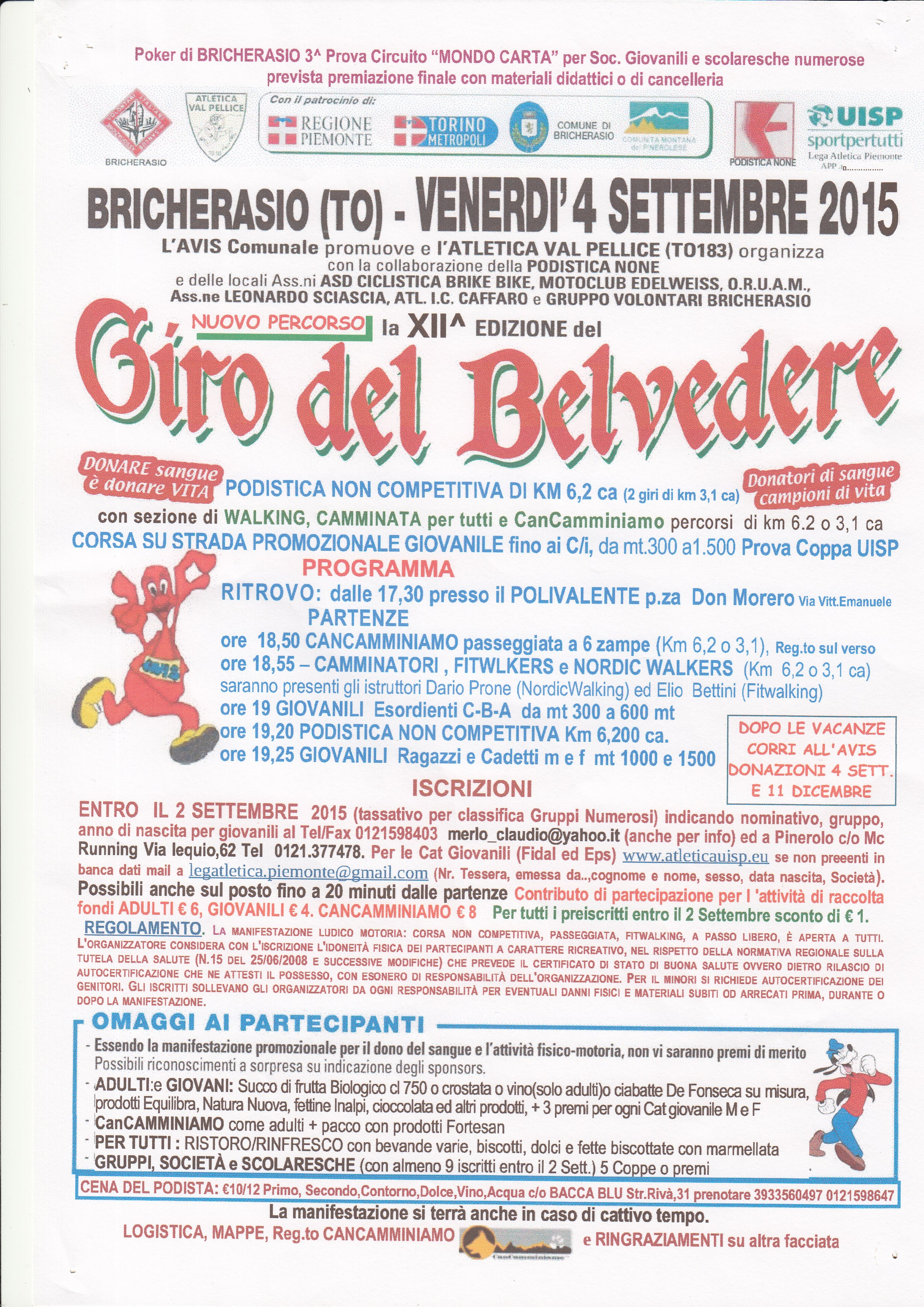 L’Avis di Bricherasio promuove e l’Atletica Val Pellice organizza in collaborazione con la Podistica None e le locali associazioni Motoclub Edelweiss, Associazione Ciclistica Brike Bike, ORUAM, Associazione “Leonardo Sciascia” ed il gruppo atletica dell’Istituto Caffaro per venerdì 4 settembre la dodicesima edizione del Giro podistico del Belvedere. La gara è una podistica non competitiva di circa 6 km ed una camminata a passo libero libera a tutti sulla collina bricherasiese, e si svolge grazie alla collaborazione con le locali associazioni Motoclub Edelweiss, Associazione Ciclistica Brike Bike, ORUAM, Gruppo Sportivo dell’Istituto “Caffaro” ed Associazione “Leonardo Sciascia” con la Podistica None e con l’Atletica Val Pellice. La corsa, prova Coppa UISP Regionale e terza prova circuito “Mondocarta” per società giovanili e scolaresche numerose e per tutti camminata non competitiva con sezioni di Walking e Can Camminiamo, passeggiata educativa a 6 zampe tra ulivi e frutteti di Bricherasio. La camminata con i cani è riservata ai camminatori accompagnati col proprio cane, muniti di guinzaglio e raccogli pupù ed è indispensabile un comportamento corretto pena l’allontanamento ad insindacabile giudizio degli istruttori cinofili professionisti. Il ritrovo per le iscrizioni è alle ore 17,30 al Salone Polivalente di Piazza Don Morero a Bricherasio, la partenza della cancamminiamo viene data alle ore 18,50. Camminatori, fitwalkers e nordic walkers partono alle 18,55 con la presenza degli istruttori Dario Prone ed Elio Bettini. Alle 19 il via agli Esordienti cat. C-B-A e alle 19,20 alla corsa podistica non competitiva. Ultima partenza alle 19,25 dei ragazzi e cadetti. Il contributo di partecipazione è di € 6,00, ridotto a 4,00 € per i giovani e per la cancamminiamo di 8 €. Le iscrizioni si possono effettuare entro il 2 settembre allo 0121/377478 e presso Mc Running di Via Lequio 62 a Pinerolo con uno sconto di 1 € oppure venti minuti prima delle partenze.
