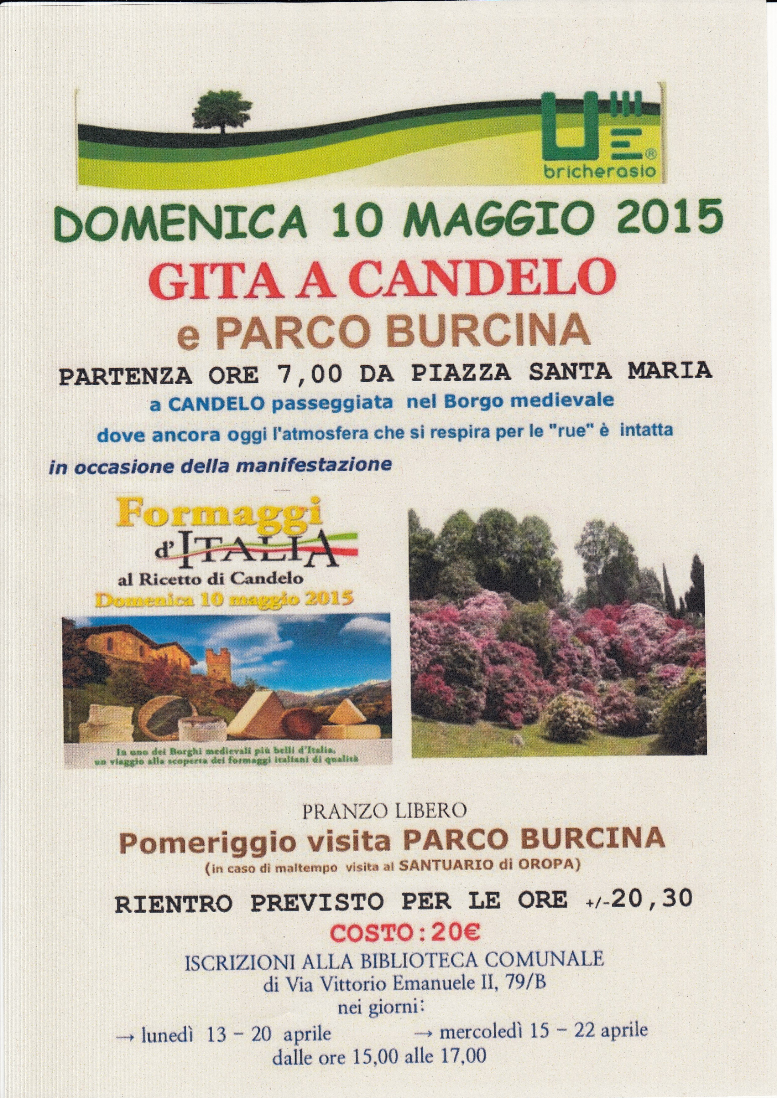 Sono aperte nei giorni di mercoledì 15 e 22 e di lunedì 20 aprile dalle 15 alle 17 presso la biblioteca comunale di Bricherasio di Via Vittorio Emanuele 79/B le iscrizioni per partecipare alla gita sociale organizzata dall’Unitre bricherasiese a Candelo e al Parco Burcina prevista per Domenica 10 maggio per una passeggiata nel Borgo Medioevale di Candelo alla scoperta dei formaggi italiani di qualità. Dopo il pranzo libero nel pomeriggio prevista la visita al Parco Burcina. In caso di maltempo visita al Santuario di Oropa. La partenza da Piazza Santa Maria alle ore 7. Il ritorno in serata verso le 20,30. La quota di partecipazione è di 20,00 €.