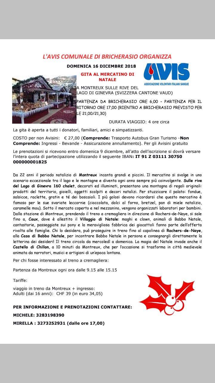 L'AVIS di Bricherasio organizza una gita a Montreux sulle rive del Lago di Ginevra in occasione del mercatino di Natale per Domenica 16 dicembre. La partenza è fissata alle ore 6 con ritorno previsto per le 21. Da oltre vent’anni il periodo natalizio di Montreux incanta grandi e piccini con 160 chalet decorati ed illuminati. Il mercatino si svolge in uno scenario eccezionale tra lago e montagne. Per informazioni e prenotazioni contattare entro domenica 9 dicembre il presidente Michele Savalli al 328/3198390 oppure, dopo le ore 17, Mirella al 327/3252931. All’atto dell’iscrizione si deve versare l’intera quota di partecipazione del viaggio di € 27, gratuito per chi ha effettuato almeno una donazione negli ultimi 2 anni e per i bambini sotto i 12 anni, utilizzando l’IBAN IT 91 Z 03111 30750 000000001825 comprendente il viaggio in autobus. Sono esclusi ingressi e bevande. Chi lo desidera può proseguire con il treno a cremagliera fino a Rochers-de-Naye, alla casa di Babbo Natale per incontrarlo di persona e consegnargli la letterina dei desideri.