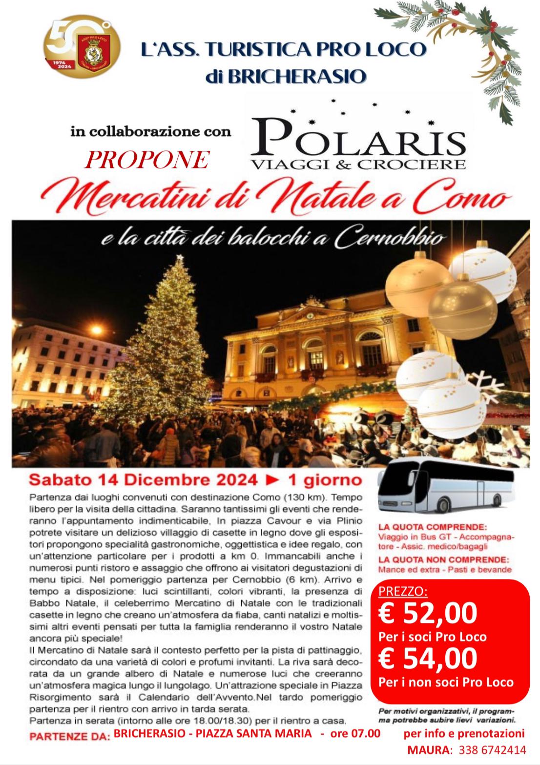 - L’Associazione Turistica Pro Loco di Bricherasio, in collaborazione con Polaris Viaggi, organizza per sabato 14 dicembre una gita ai Mercatini di Natale a Como e nella città dei balocchi a Cernobbio per visitare la splendida cittadina sul lago con il suo delizioso villaggio di casette in legno dove vengono proposte le specialità gastronomiche, oggettistica ed idee regalo. A Cernobbio luci scintillanti, colori vibranti e Babbo Natale attendono i partecipanti con l’atmosfera da fiaba, canti natalizi e moltissimi eventi pensati per le famiglie. Il mercatino è il contesto perfetto per la pista di pattinaggio, con la riva del lago decorata dal grande albero natalizio e luci sfavillanti che creano un’atmosfera magica per il lungolago. Il programma della giornata prevede la partenza da Piazza Santa Maria alle ore 7 con pranzo libero e la partenza per il rientro prevista alle ore 18/18,30. La quota di partecipazione, comprensiva del viaggio su pullman Gran Turismo e accompagnatore, è di 52 € per i tesserati Pro Loco e di 54 € per gli altri.