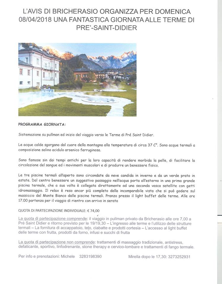 L'AVIS di Bricherasio organizza una fantastica giornata alle terme di Prè Saint Didier per Domenica 8 aprile per gustare le tre piscine termali all’aperto circondate dalla neve. La partenza dal paese è fissata alle ore 7 da Piazza Santa Maria con ritorno previsto per le 19,30. La quota di partecipazione individuale alla gita è fissata in 74 € e comprende viaggio, ingresso alle terme con l’utilizzo delle strutture termali, la fornitura di accappatoio, telo, ciabatte, prodotti di cortesia e l’accesso al light buffet per il pranzo con frutta, prodotti da forno, infusi e succhi di frutta. Per informazioni e prenotazioni contattare il Presidente Michele Savalli al 328/3198390 oppure, dopo le ore 17, Mirella al 327/3252931.