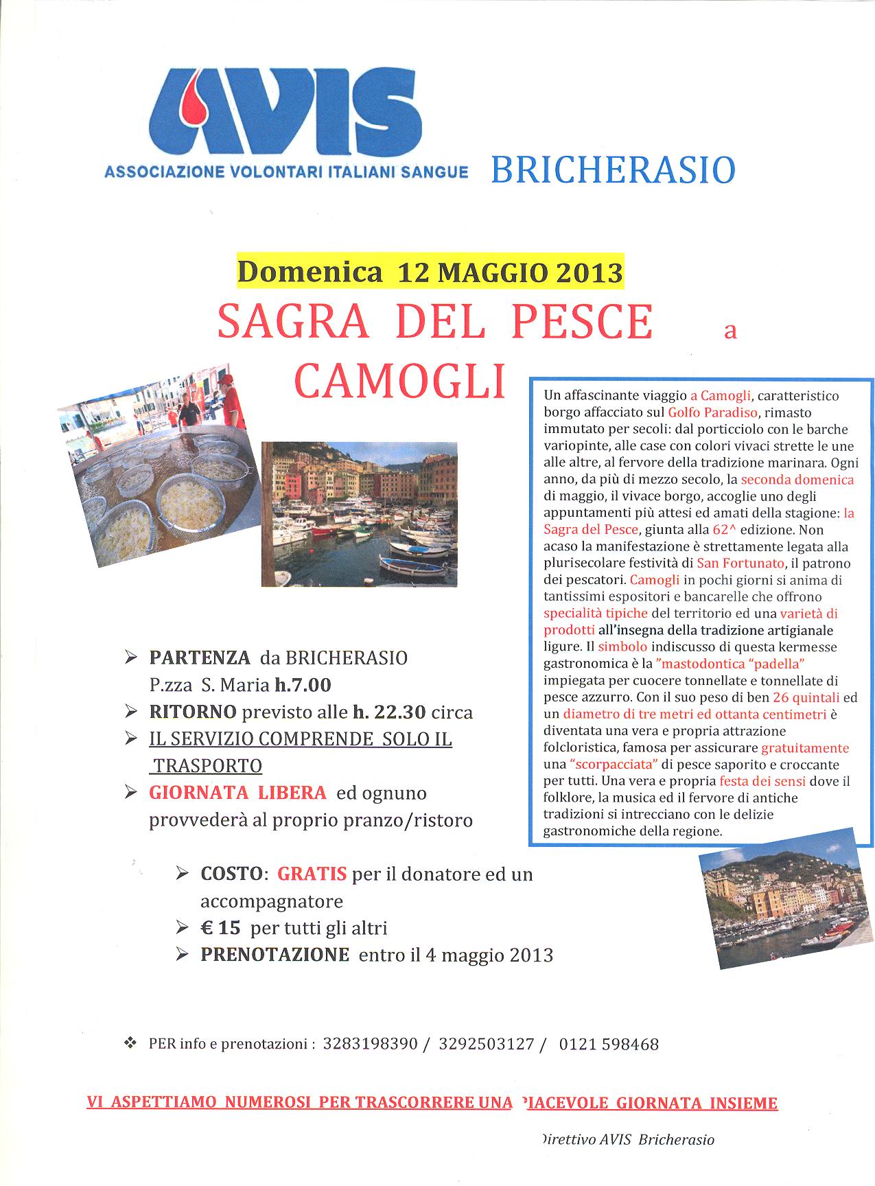 L’Avis di Bricherasio, in occasione della ”Sagra del Pesce 2013” propone una piacevole gita a Camogli per Domenica 12 maggio con degustazione gratuita della frittura di pesce preparata nella padella più grande del mondo. La partenza da Piazza Santa Maria è prevista alle ore 7,00. Il ritorno previsto in tarda serata. Il servizio comprende solo il trasporto e la giornata è libera ed ognuno deve provvedere al proprio ristoro. La partecipazione è gratuita per i donatori ed un accompagnatore per tutti gli altri il costo è di € 15,00 e occorre prenotarsi entro sabato 4 maggio ai numeri: 328/3198390, 329/2503127 e 0121/598468.