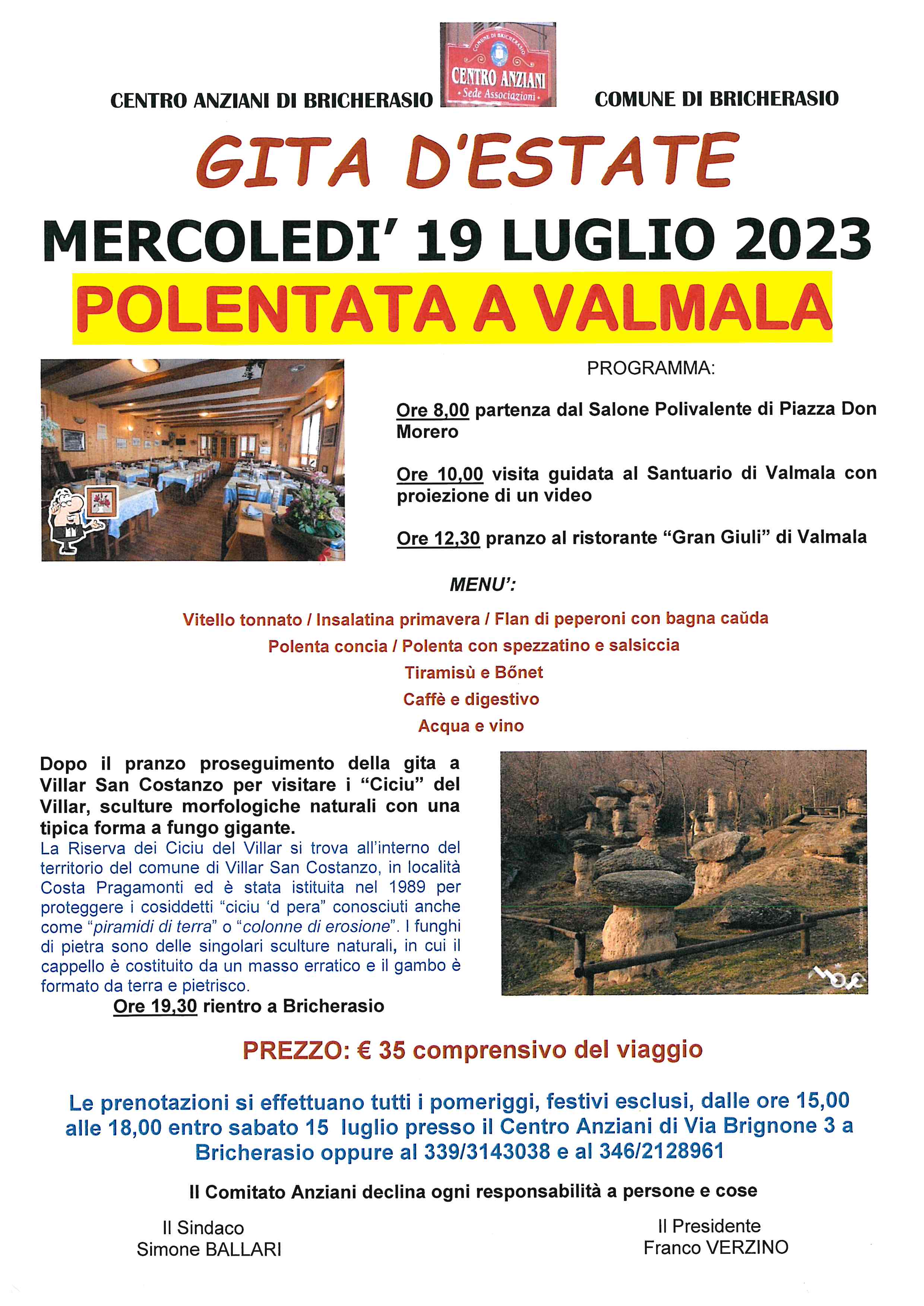 Il Centro Anziani di Bricherasio, in collaborazione con il Comune, organizza la gita d’estate per la tradizionale polentata mercoledì 19 luglio a Valmala. Il programma prevede alle ore 8 la partenza dal Salone Polivalente di Piazza Don Morero di Bricherasio per Valmala per la visita guidata al Santuario con proiezione di un video. Alle 12,30 il pranzo al ristorante “Gran Giuli” e dopo proseguimento della gita a Villar San Costanzo per visitare i “Ciciu” del Villar, sculture morfologiche naturali con una tipica forma a fungo gigante. Alle 19,30 previsto il rientro a Bricherasio. Informazioni e prenotazioni entro sabato 15 luglio tutti i pomeriggi, esclusi festivi, dalle ore 15,00 alle 18,00 al Centro Anziani di Via Brignone, 3 a Bricherasio oppure telefonando ai numeri 339/3143038 oppure 346/2128961. Il costo è fissato in € 35 a persona comprensivo del viaggio in pullman.