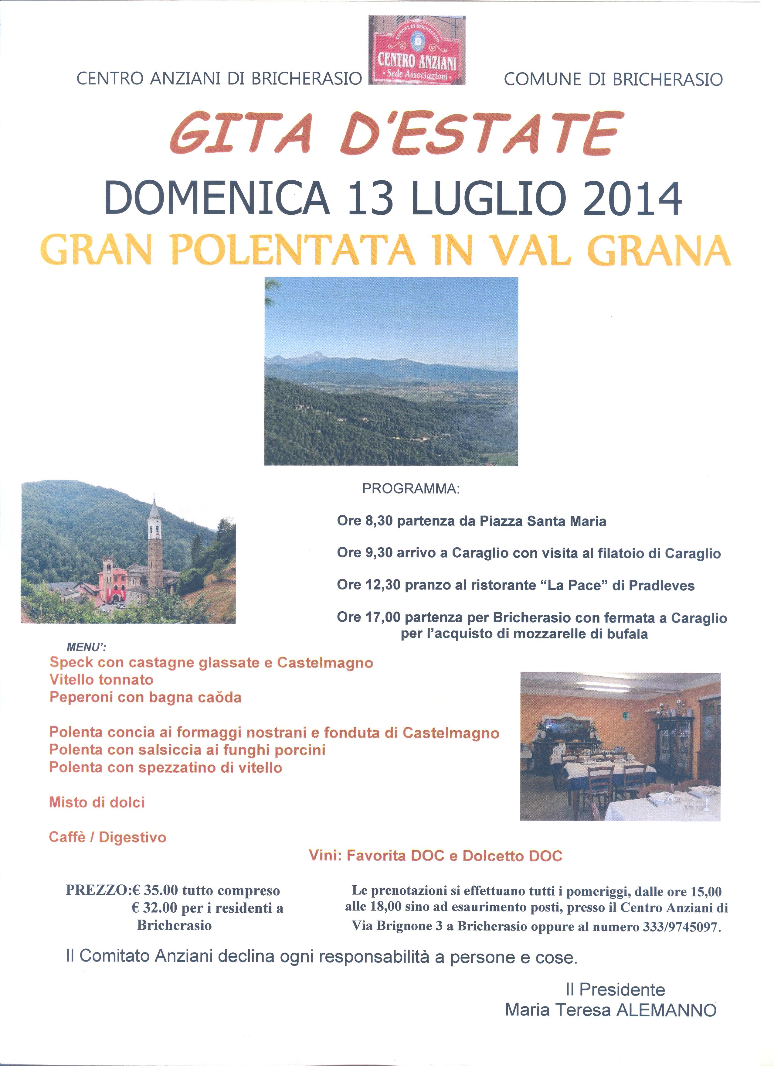 Il Centro Anziani di Bricherasio, in collaborazione con il Comune, organizza la gita d’estate per la tradizionale polentata Domenica 13 luglio in Val Grana. Il programma prevede alle ore 8,30 la partenza da Piazza Santa Maria di Bricherasio, per una prima sosta a Caraglio per la visita al filatoio del paese. Alle ore 12,30 il pranzo presso il ristorante “La Pace” di Pradleves con un menu che prevede, dopo tre antipasti, polenta con spezzatino, salsiccia e formaggi misti che precedono un misto di dolci e caffè. Alle 17 la partenza per il rientro a Bricherasio con ulteriore fermata a Caraglio per acquistare mozzarelle di bufala. Informazioni tutti i pomeriggi, dalle ore 15,00 alle 18,00 presso il Centro Anziani di Via Brignone, 3 a Bricherasio oppure telefonando al 333/9745097.